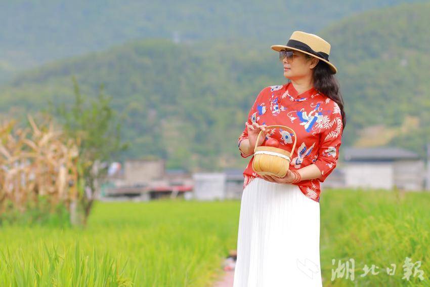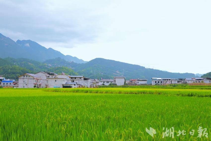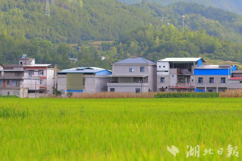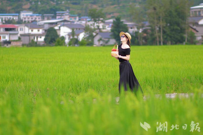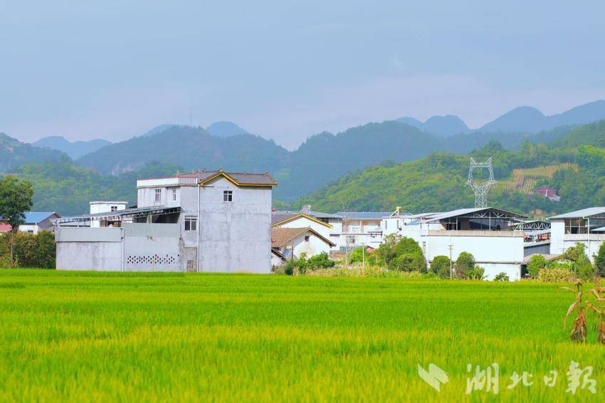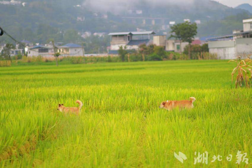 湖北日报客户端讯(通讯员胡自丹、郭有才)近日,步入三里乡河水坪,广袤稻田如绿毯铺展,与错落农舍、层叠山峦相融,白墙黛瓦间升起炊烟袅袅。稻丛中偶见小狗穿梭,平添田野灵动。游客撑伞漫步、红装点缀田间。