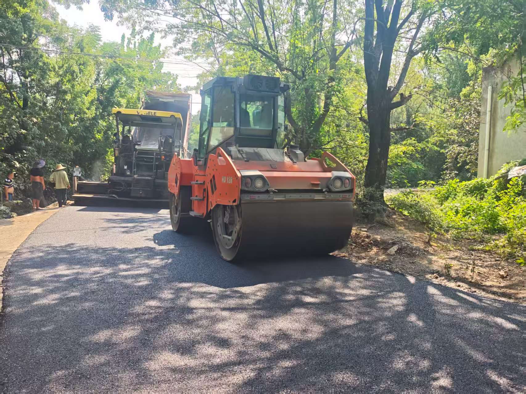 施工过程中,主干道沿线村民自发清理房前屋后和门前道路两侧的垃圾杂物,摊铺机、压路车、洒水车等机械轰鸣,10余名施工人员和热心村民顶着烈日有序作业,村“两委”干部主动参与维护施工路段现场秩序,确保道路施工安全、通畅。