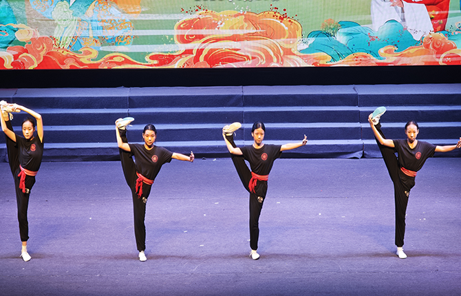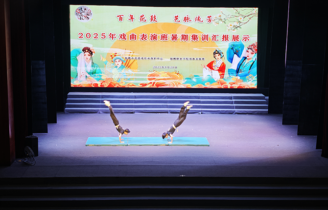 汇报展示在紧凑而丰富的节目流程中拉开帷幕。首先登场的是男女生基本功展示,学员们一招一式扎实稳健,无论是踢腿、下腰还是虎跳翻身,动作干净利落,展现出对传统戏曲基本功的严谨追求。紧接着的男女生唱腔表演,学员们用或婉转悠扬、或铿锵有力的声音唱出了花鼓戏的韵味,赢得了现场阵阵掌声。随后的身训展示,则进一步融合了身段与技巧,学员们配合默契,将水袖、折扇等道具运用与情感表达相结合,生动演绎了花鼓戏“以形传神”的艺术特色。最后,乐队演奏环节为整场汇报增添了别样风采,悠扬的旋律与戏曲节奏完美融合,展示了戏曲文武乐的独特魅力。