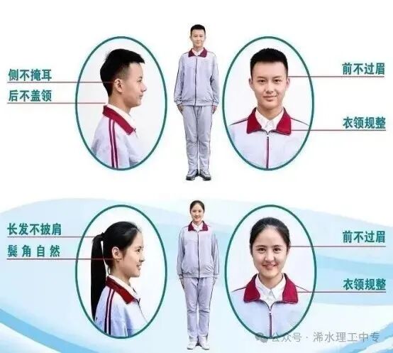 4.请督促孩子做好仪容仪表(参照下图)自查,请勿让孩子留长发、染发、戴首饰等不合要求来校报到。