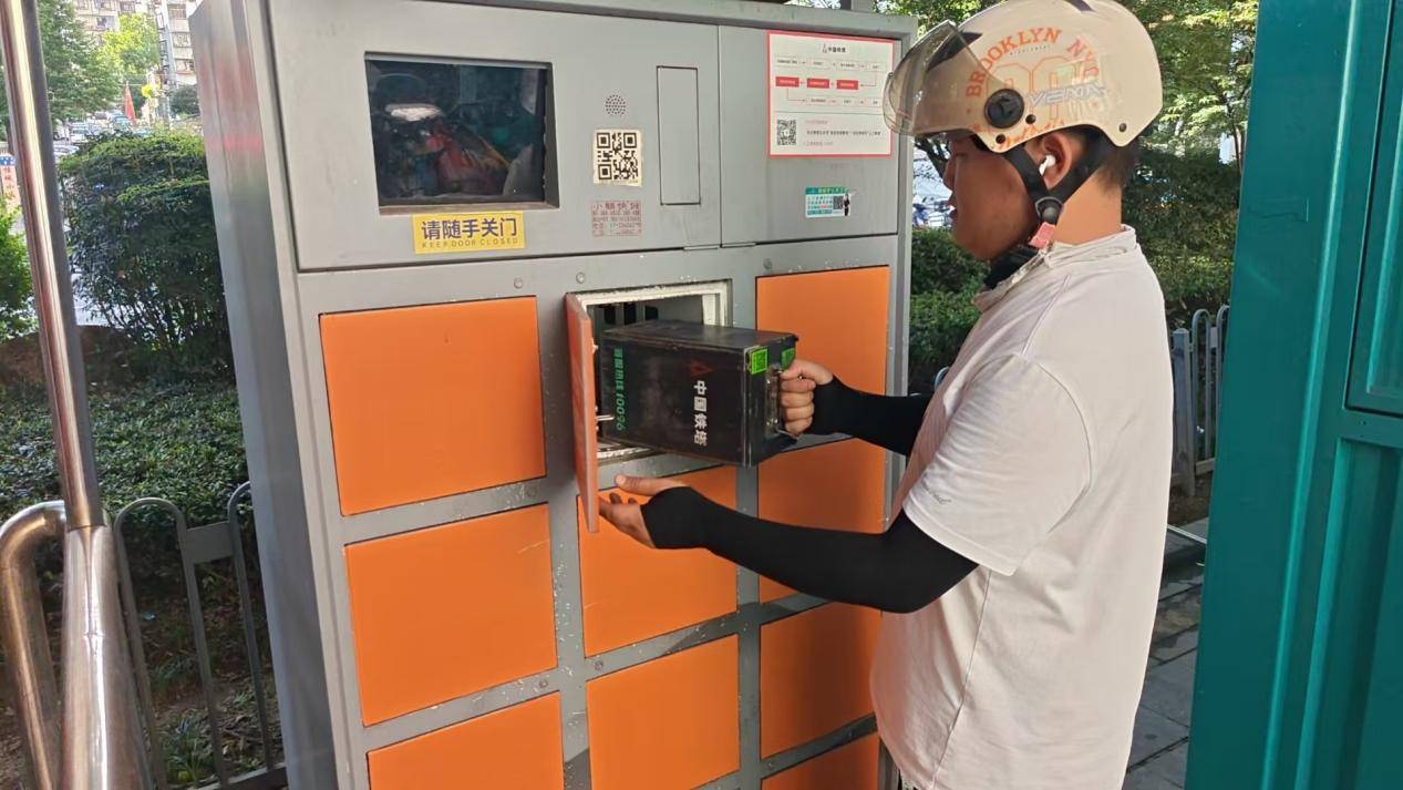 如今这一难题得到了有效破解。在福久源商圈工会驿站附近,标有“中国铁塔”字样的共享换电柜十分惹眼。它形似共享充电宝柜,却专为电动车电池服务。骑手停车、扫码、取满电电池、换电池、出发,全程不到一分钟,高效又省心。