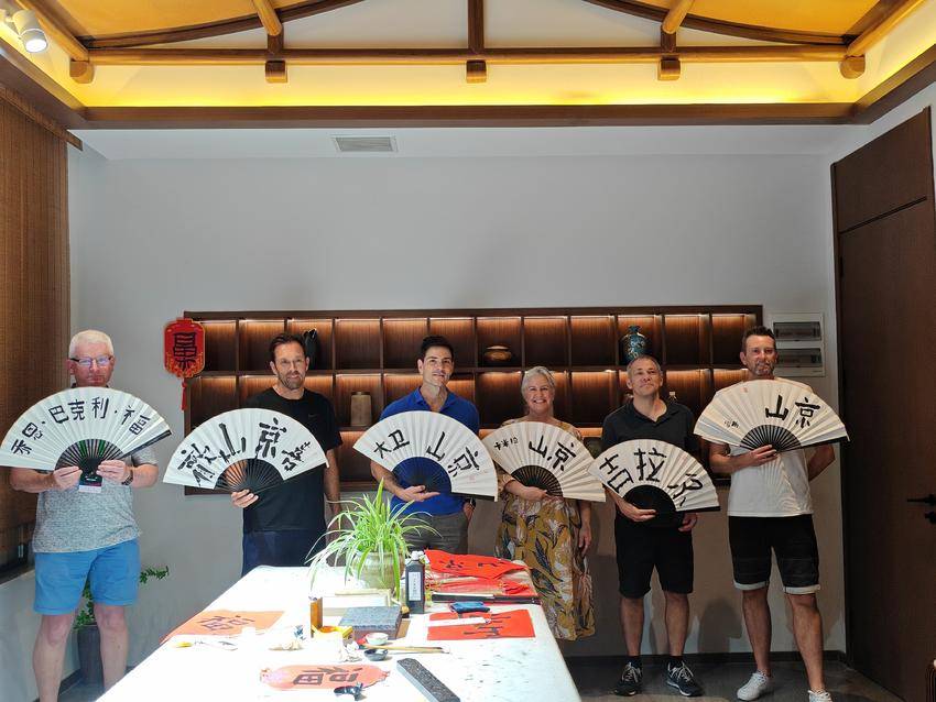 紧接着,老师让友人们体验了拓片模板,拓印出的“暴富”“财神爷”“吉祥如意”等作品深得友人们的喜欢。老师也为各位友人准备了自己书写的书签作为纪念品送给大家,让友人们亲自感受印章,确保了正文、落款和钤印的完整性。友人们意犹未尽,自我发挥挑战在难度较高的折扇上面写字,有的写“喜欢京山”,有的写“京山+自己的中文名字”,合影环节,大家拿着自己写的作品用中文说:“打网球到京山”“我爱京山”,留下了最珍贵的回忆。