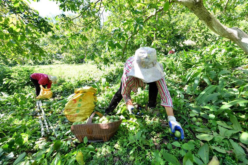 保康县寺坪镇樟木沟村核桃种植基地里,一排排核桃树枝繁叶茂,青翠的果实压弯了枝头。村民们手持长竿敲打树枝,一颗颗核桃青果簌簌落地。