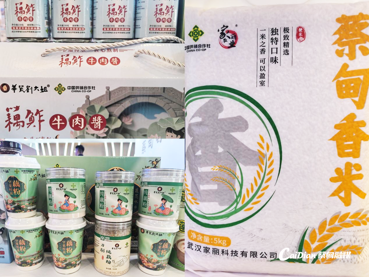 蔡甸供销华贸商城总经理刘华秀介绍,本次重点展出的“贡莲”“贡品莲”系列产品,是蔡甸供销社最新开发的首款“本地种植、本地加工、本地注册”的高端莲藕品牌产品。而蔡供沉湖生态香丝米则依托国际湿地生态背景,推行全流程品控,致力打造放心粮、生态米。