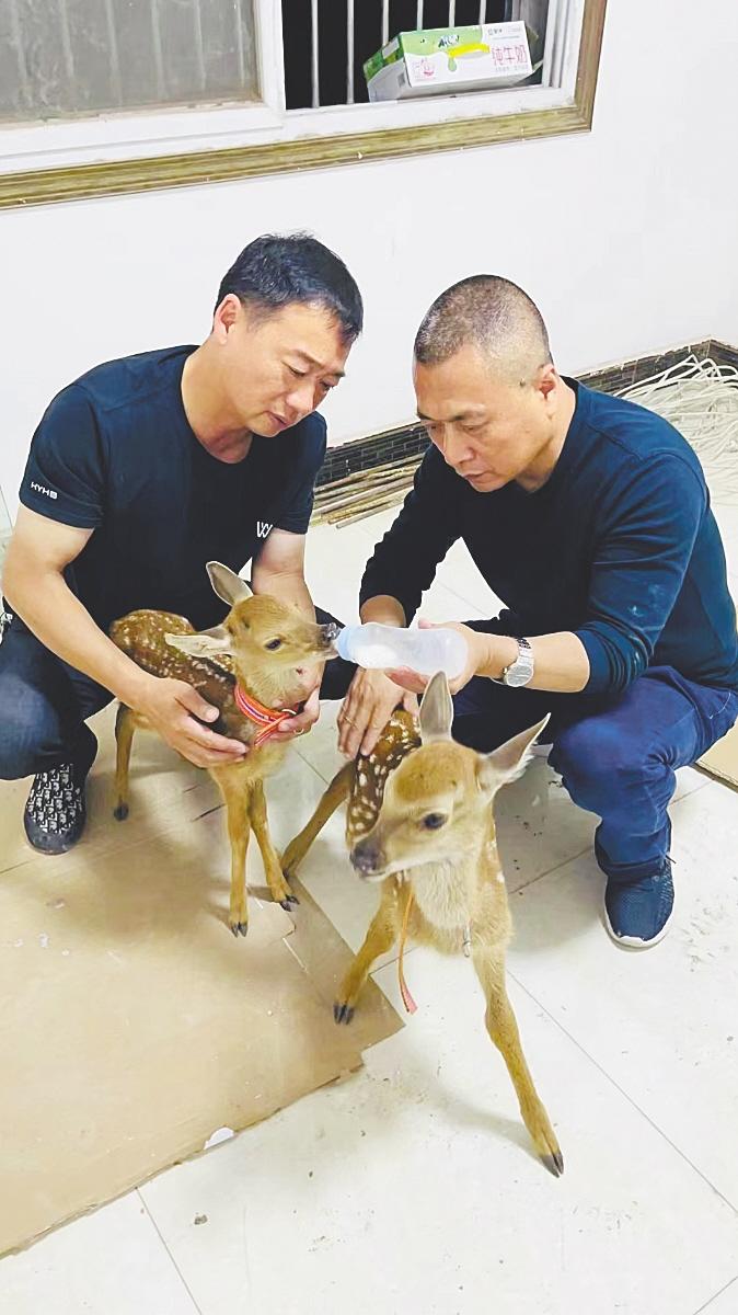 张鹏(左)和同事一起救助小梅花鹿。(受访单位供图)