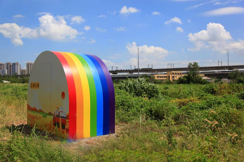 而在环保工业园地块,创意远不止于绿——两座明亮的“彩虹工具棚”悄然登场,像是大地突然弹出的彩色积木,点亮了高铁旅客的视觉体验。该区域采用了“播种+栽植”的立体复绿方案,在4万平方米的土地上播撒了草籽和350株树苗,实现了从黄土裸露区到生态板块的华丽转身。