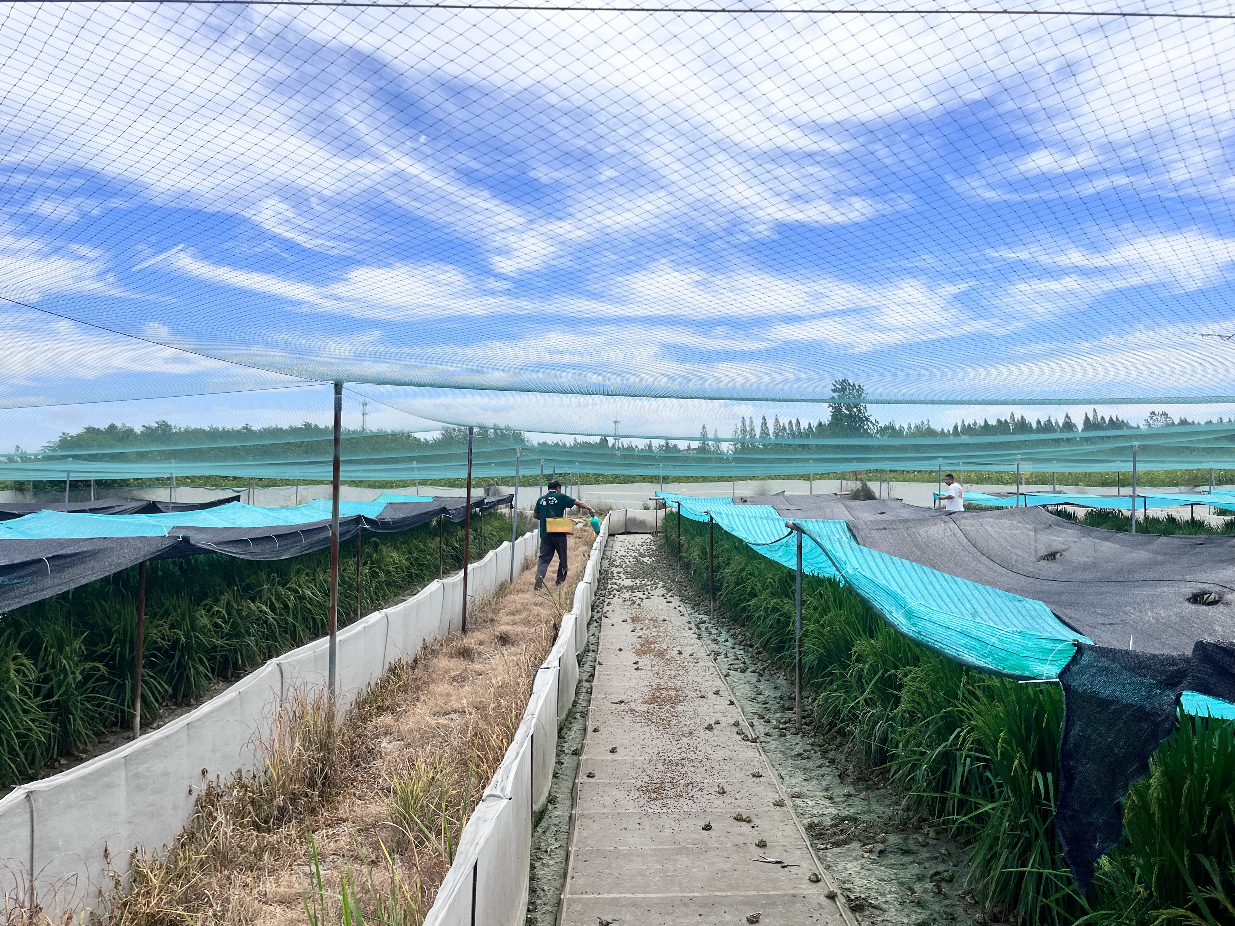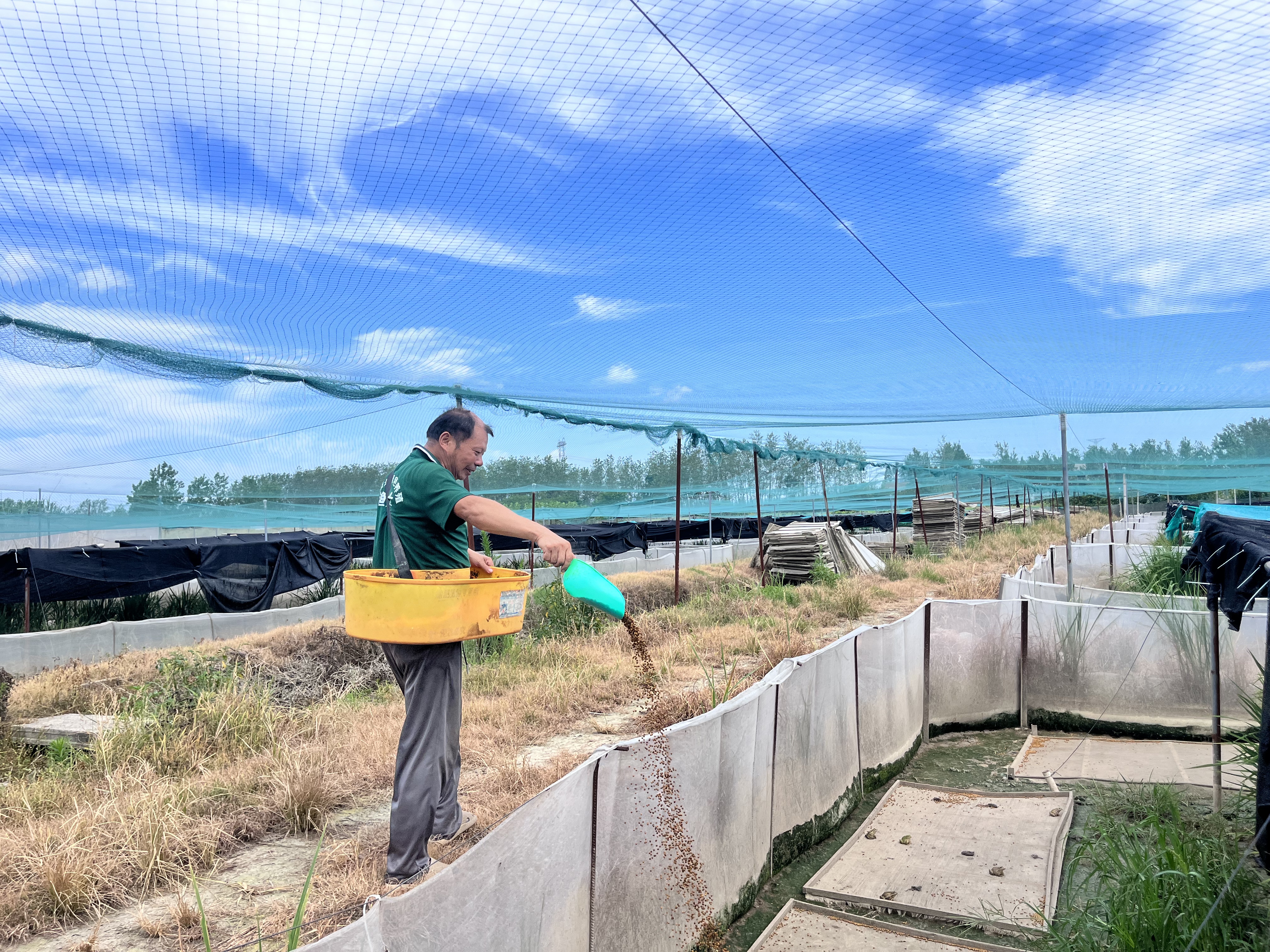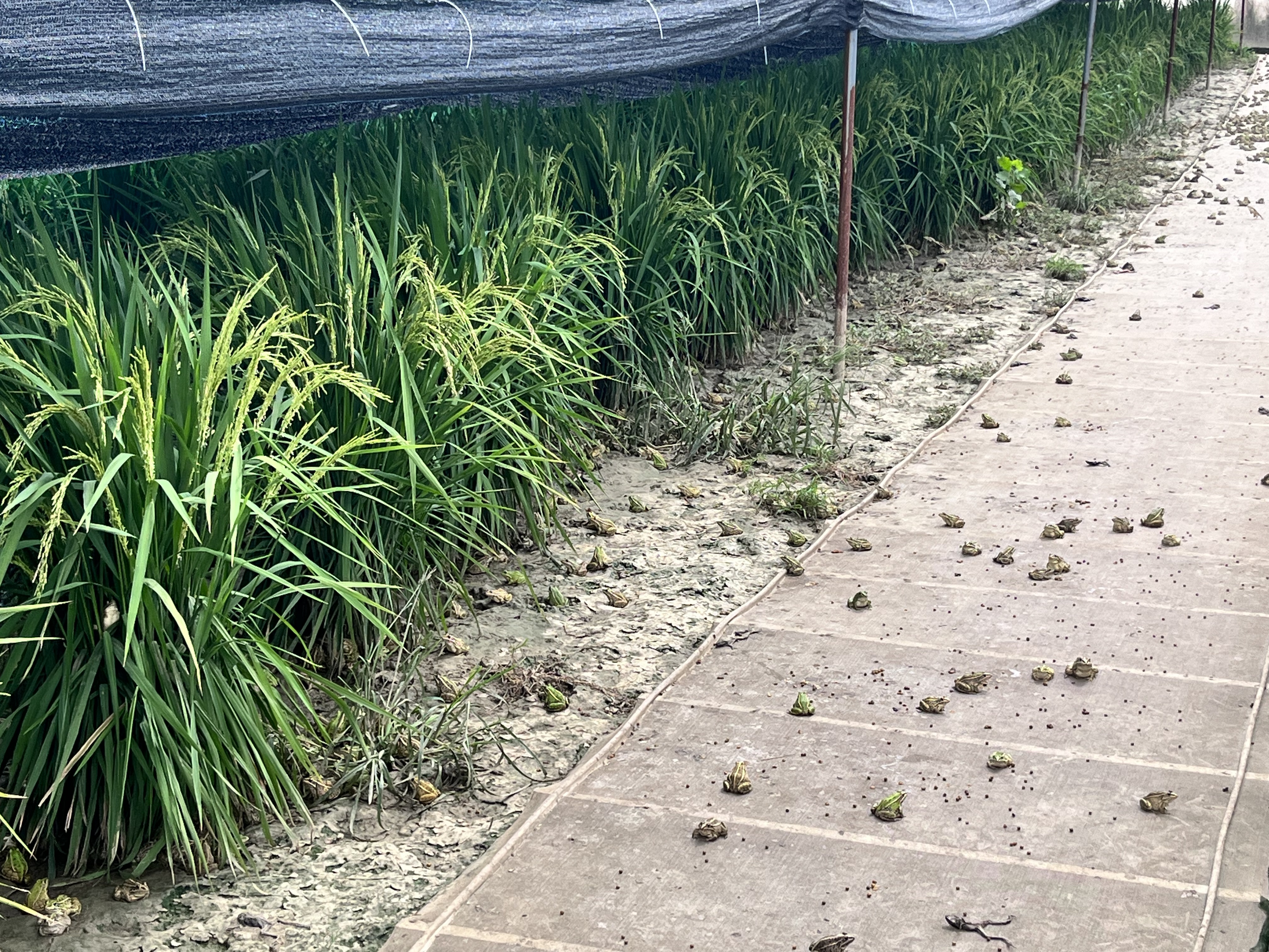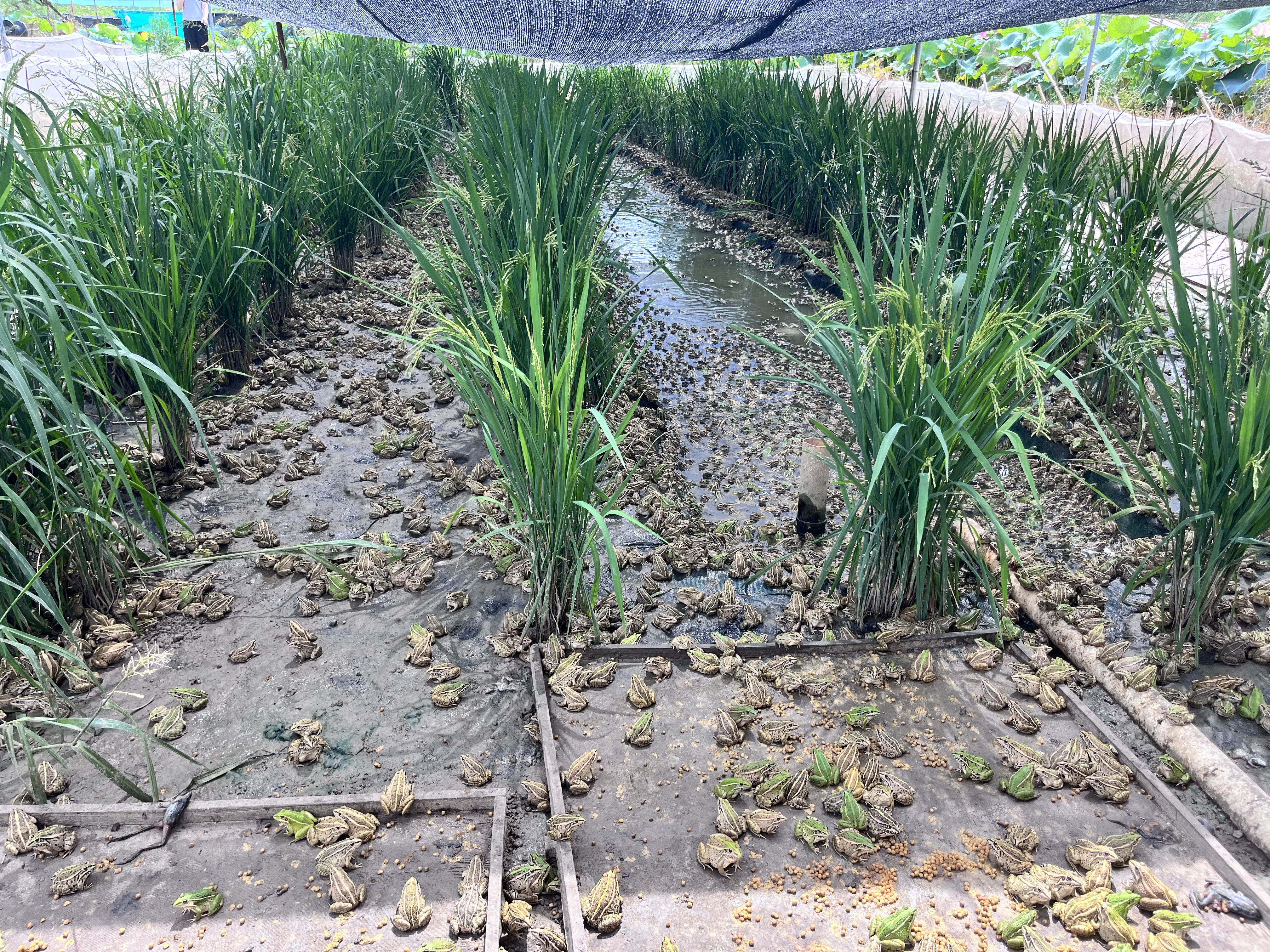 基地负责人谢胜莫正提着饲料桶穿梭在田埂间,准备给黑斑蛙投喂。他刚走进网罩区域,原本聚在一起“晒日光浴”的黑斑蛙瞬间“炸开了锅”,“噗通噗通”纷纷跃入稻丛,生机勃勃,热闹非凡。
