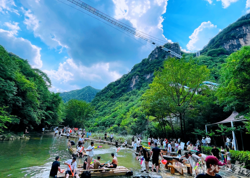 “受七夕与暑期叠加效应影响,目前景区日均接待游客已超1500人次,已累计接待旅行团近百个。”五龙河景区工作人员肖燕介绍,“织女谷”景点最受青睐,游客在此沉浸式感受牛郎织女爱情传说,参与民俗互动、拍照打卡,现场欢声笑语不断。为应对客流高峰,景区不仅增派人员、强化安全保障,还推出七夕祈福、篝火晚会等特色活动,全方位提升游客体验、烘托节日氛围。