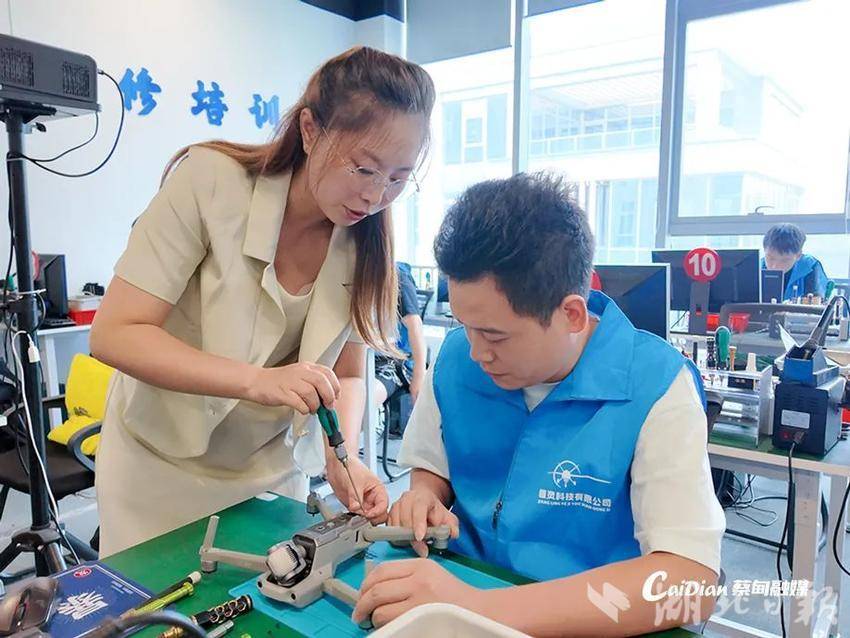在中法武汉生态示范城特斯联科创园区的武汉疆灵科技有限公司实训基地内,“90后”易娟正专注地指导学员操作无人机检测设备。学员群体十分多元,既有应届毕业生,也有受行业调整而失业的中年人。该基地通过开展无人机维修与保养技能培训,为他们搭建起一座助力就业的“云端桥梁”。