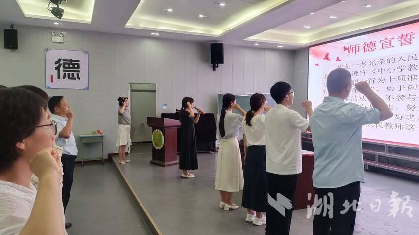 今年入职的5位新教师,身着整洁的服装,在全体教师的注视下走上讲台。他们中,有的刚走上工作岗位时间不长,眼神里还带着些许青涩;有的曾在农村学校任教,眉宇间藏着对教育的执着。当领誓人举起右拳时,他们齐刷刷地将手贴在胸前,掌心的温度仿佛能点燃空气中的庄重。