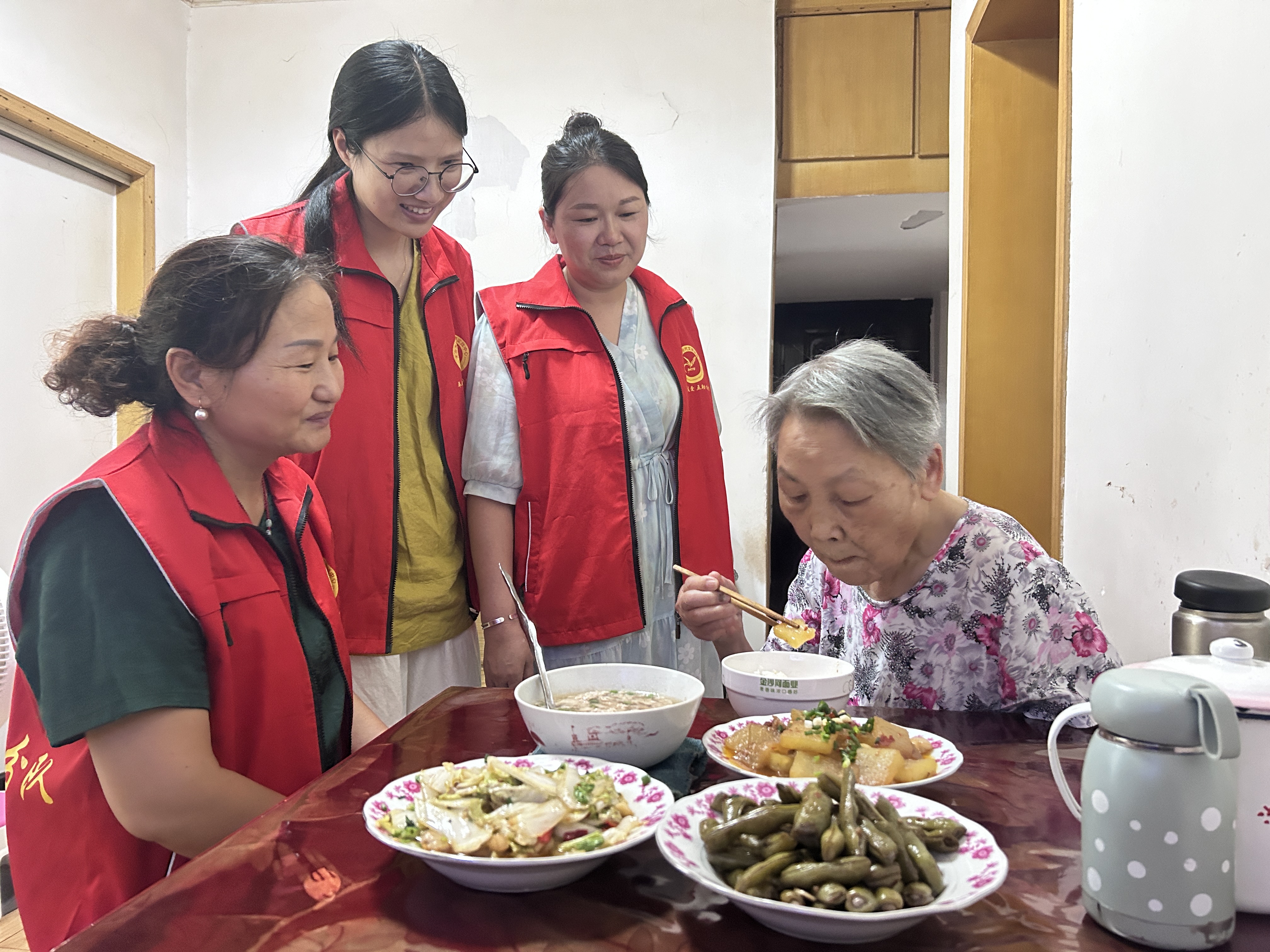 而在大冶大道,90岁的彭继秀奶奶正对着冷锅冷灶犯愁——独居的她,吃饭总爱“将就一口”。小分队知道后,几个人一商量:“得给奶奶做顿合口味的饭!”忙完工作,几人就往老人家里赶,小厨房里瞬间热闹起来:有人切冬瓜、有人炒青菜、有人蒸汽水肉,不一会儿,菜香、饭香就溢满了屋子。