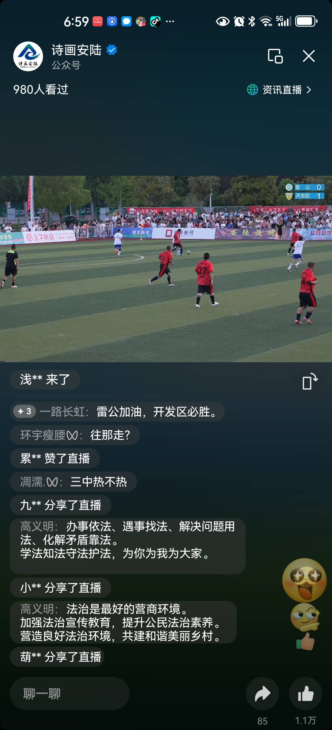 “安陆乡超” 赛场普法的同时,普法志愿者利用抖音、公众号直播间向群众普法,在线收集广大网友的疑惑并现场解答。