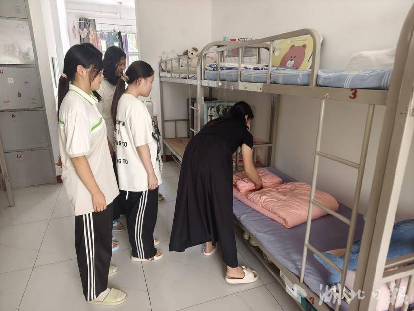 学校安排宿管团队提前完成寝室清洁消毒,并在寝室张贴“内务整理标准示意图”。报到期间,宿管老师与志愿者现场示范被子叠放、衣物收纳,讲解安全规范,引导新生自主整理内务;同步开展“寝室长微培训”,普及生活常识,帮助新生适应集体生活。