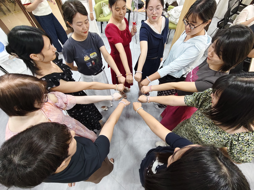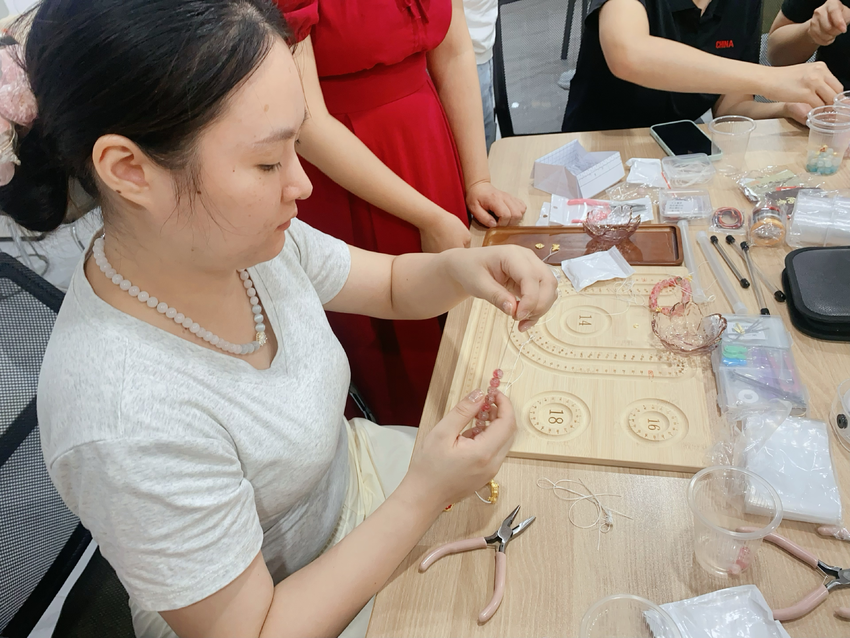 活动现场,社区为大家准备了丰富多样的材料,有五颜六色的琉璃珠、晶莹剔透的水晶珠、造型可爱的卡通珠,还有各种精致的配饰和弹力线。手工老师从串珠的基本技巧讲起,一步步教大家如何搭配颜色、设计款式,制作出独一无二的炫彩手串。
