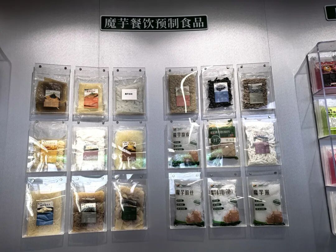 墙上陈列着琳琅满目的魔芋产品:各类魔芋亲水胶体、休闲零食、食品及茶饮小料,甚至宠物罐头材料等琳琅满目……不仅如此,魔芋还凭借其高分子材料的特性,拓展出美妆洗护等多类衍生品。