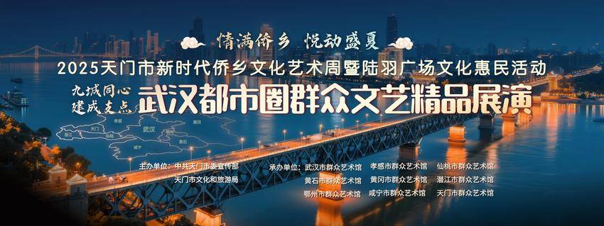 作为2025天门市新时代侨乡文化艺术周暨陆羽广场文化惠民活动的压轴大戏——武汉都市圈群众文艺精品展演,成功打造了区域文化交流互鉴的艺术盛宴。来自武汉、鄂州、黄石、咸宁、孝感、黄冈、仙桃、潜江及天门九地的群众艺术馆精英齐聚茶圣故里,携手为全市人民及八方游客奉献了一场凝聚荆楚风情、彰显新时代精神的文艺大餐。