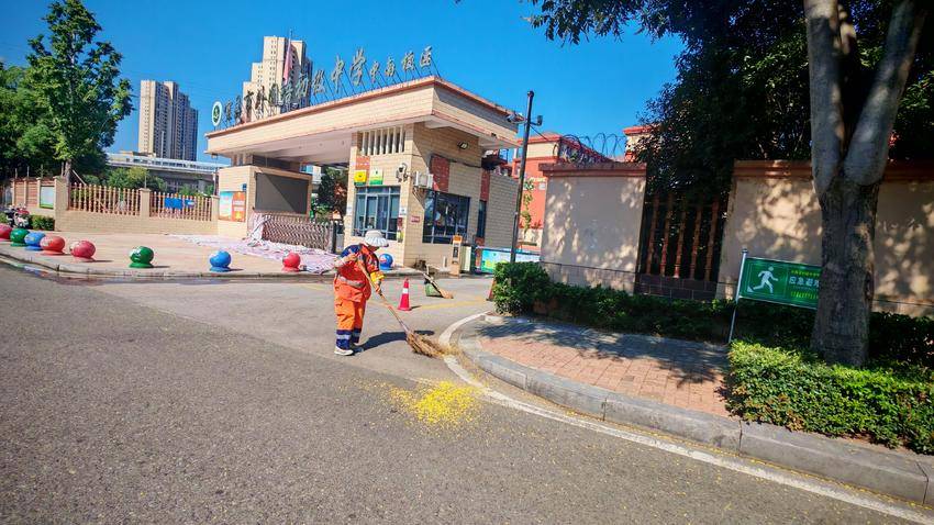 督导各区环卫部门全面冲洗主次干道及校园周边道路、绿化带,对垃圾容器、环卫公厕、公交站台进行精细保洁与消毒,清除卫生死角。提前预估开学后重点区域人流密度,在高峰时段(7:00-8:30、16:00-18:00)增派保洁人员与作业车辆,开展错时、静音收运垃圾,确保不满溢、无噪音。同步延长校园周边公厕城市服务驿站开放时间,确保设施设备完好无损,加密保洁消毒,保障整洁无异味。