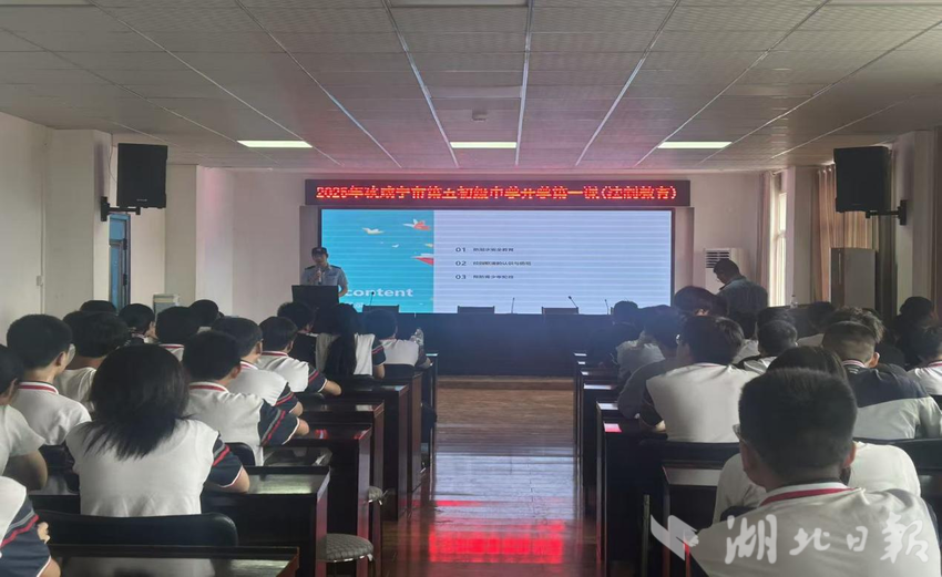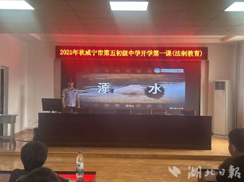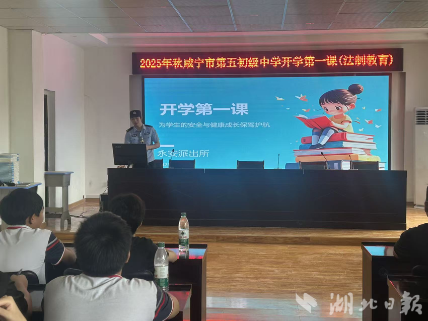 湖北日报客户端讯(通讯员魏君超、乔雨欣)秋风送爽,新程伊始。为切实加强青少年法治教育,提升学生的法律意识与自我保护能力,营造平安、和谐、文明的校园环境,9月1日开学当天,咸宁市第五初级中学特别邀请永安派出所警官走进校园,为全体初中生带来了一堂生动而深刻的“开学第一课”——法制安全教育讲座。