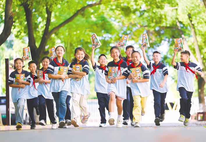 9月1日,开学第一天,襄阳市樊城区竹条中心小学的学生们在校园里拿着刚领取的新课本,迎接新学期的到来。 (湖北日报全媒记者 魏鹏 通讯员 聂志鹏 杨红玫 摄)