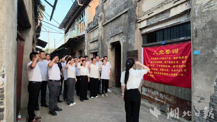 在供销社旧址旁,全体党员面对党旗,庄严重温入党誓词。铿锵誓言回荡老街,传递出对先辈的深切缅怀与对使命的坚定承诺。
