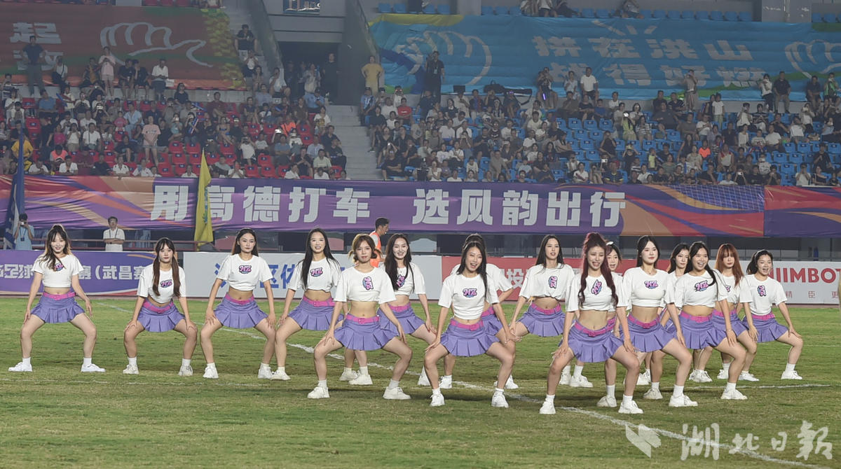 “让我们有请MZ职业啦啦队,为我们带来精彩的表演!”9月2日晚,在武汉市洪山区文体中心,汉超联赛洪山区与青山区比赛的中场间隙,伴随着动感的音乐,MZ啦啦队为球迷们献上热舞。表演结束后,啦啦队队员们来到看台边,与球迷互动,送上“蒜鸟”等文创小礼品,引来球迷阵阵欢呼。