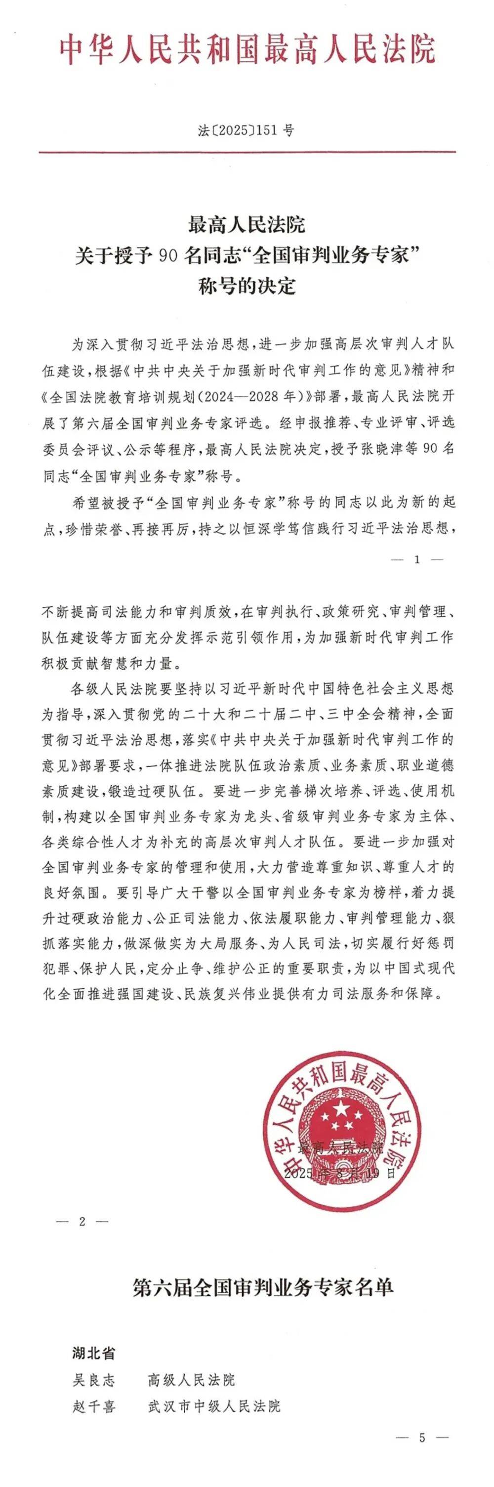 近日,最高人民法院通报第六届全国审判业务专家评选结果,武汉市中级人民法院知识产权审判庭副庭长赵千喜获评“全国审判业务专家”。