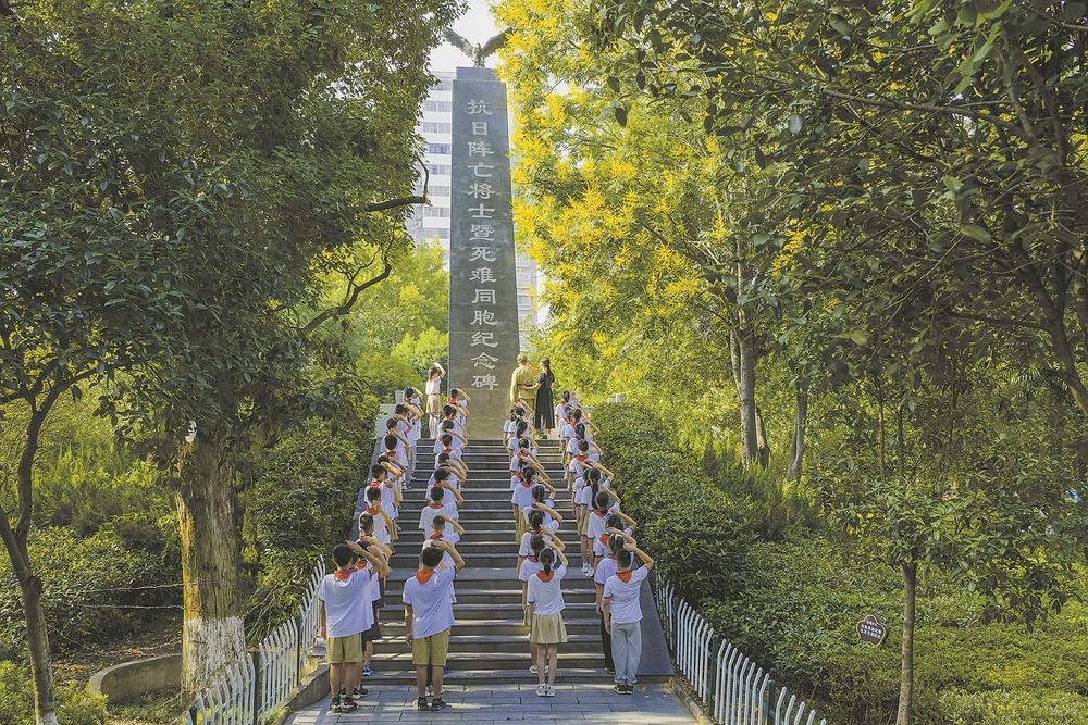 9月3日,老河口市第八小学的学生们在中山公园抗日阵亡将士暨死难同胞纪念碑前敬礼,聆听抗战烈士后代讲述历史,接受爱国主义教育。引导青少年铭记历史、传承红色基因。(来源:襄阳日报