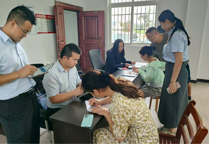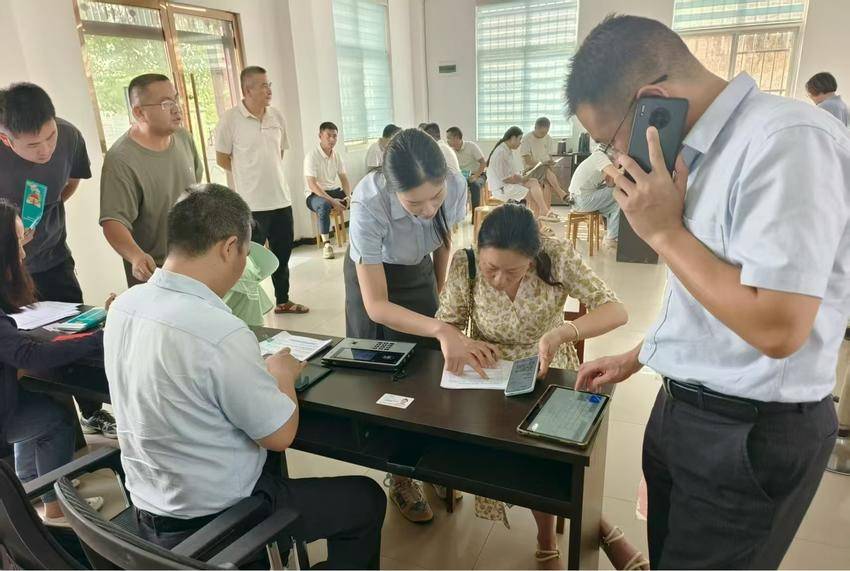 陡岗镇由主要领导牵头,联合多部门及村干部组建专项服务团队。各村均设立临时服务点,通过发放宣传册、一对一答疑等方式解读政策,同步为群众办理业务;农业银行工作人员现场提供开卡服务,并完成公积金账户绑定,实现“一站式”高效办理。