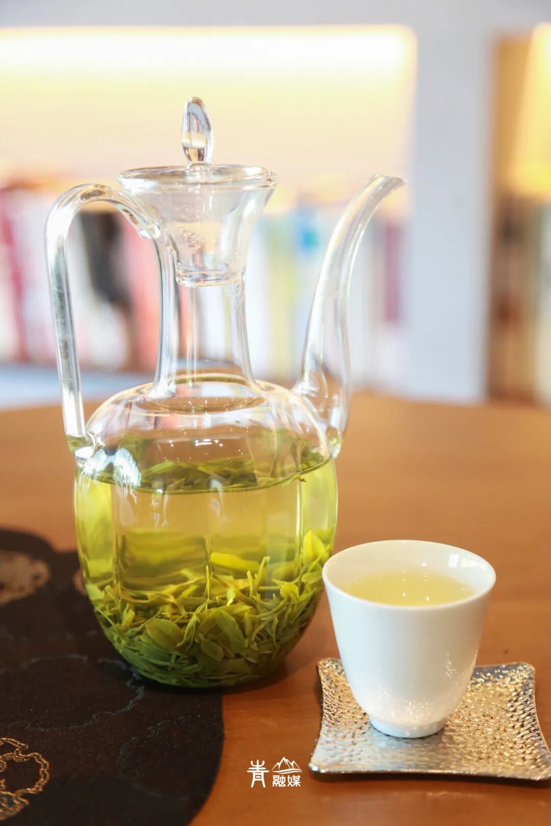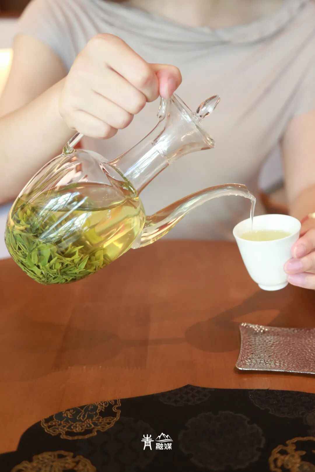 倒入杯中品饮,观茶色,色泽苍翠绿润,纤细挺直如针。经过85度左右水温浸泡后,芽叶舒展,初见时婷婷悬浮杯中,继而沉降杯底,如同一幅青绿山水画卷。