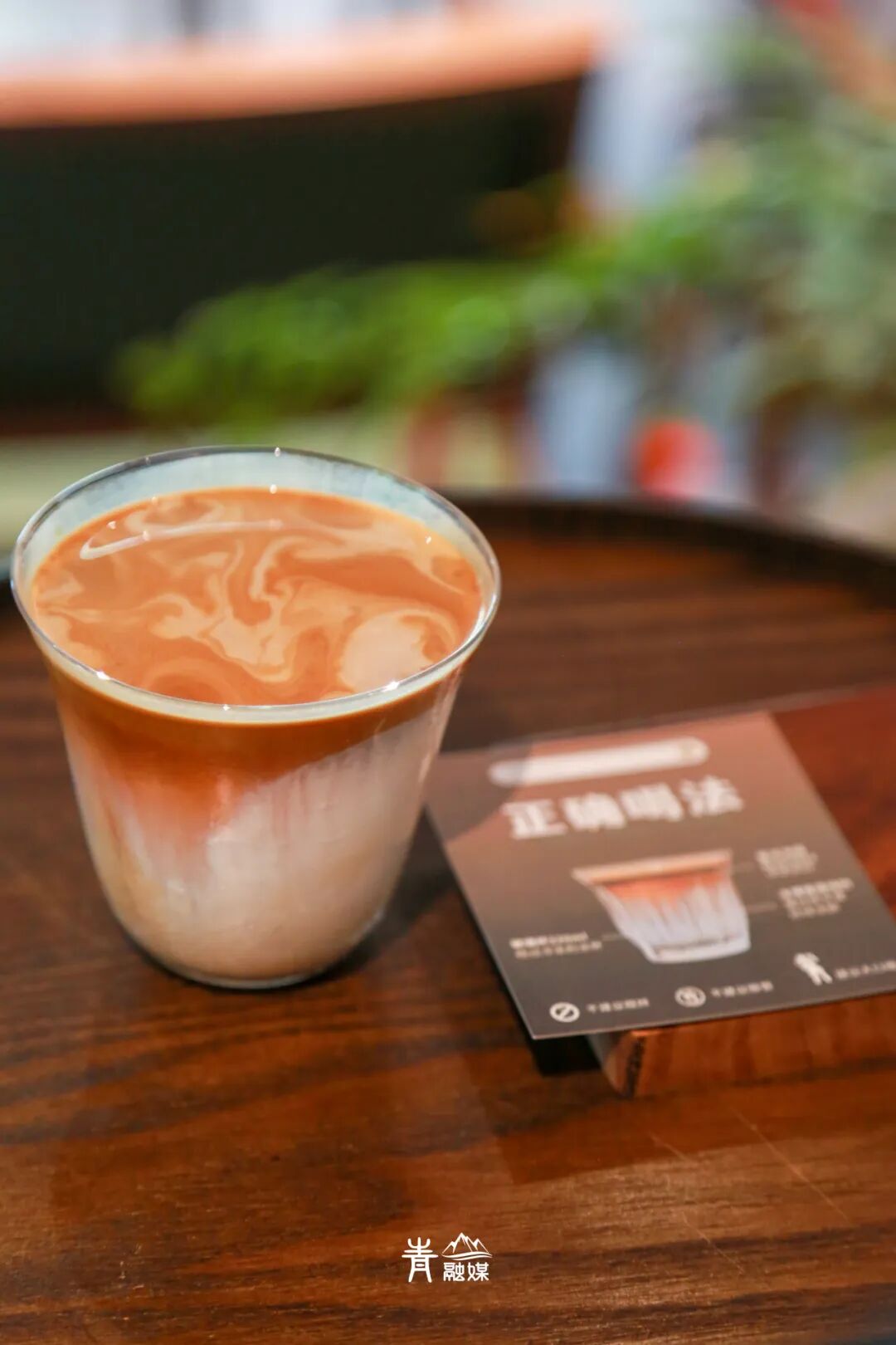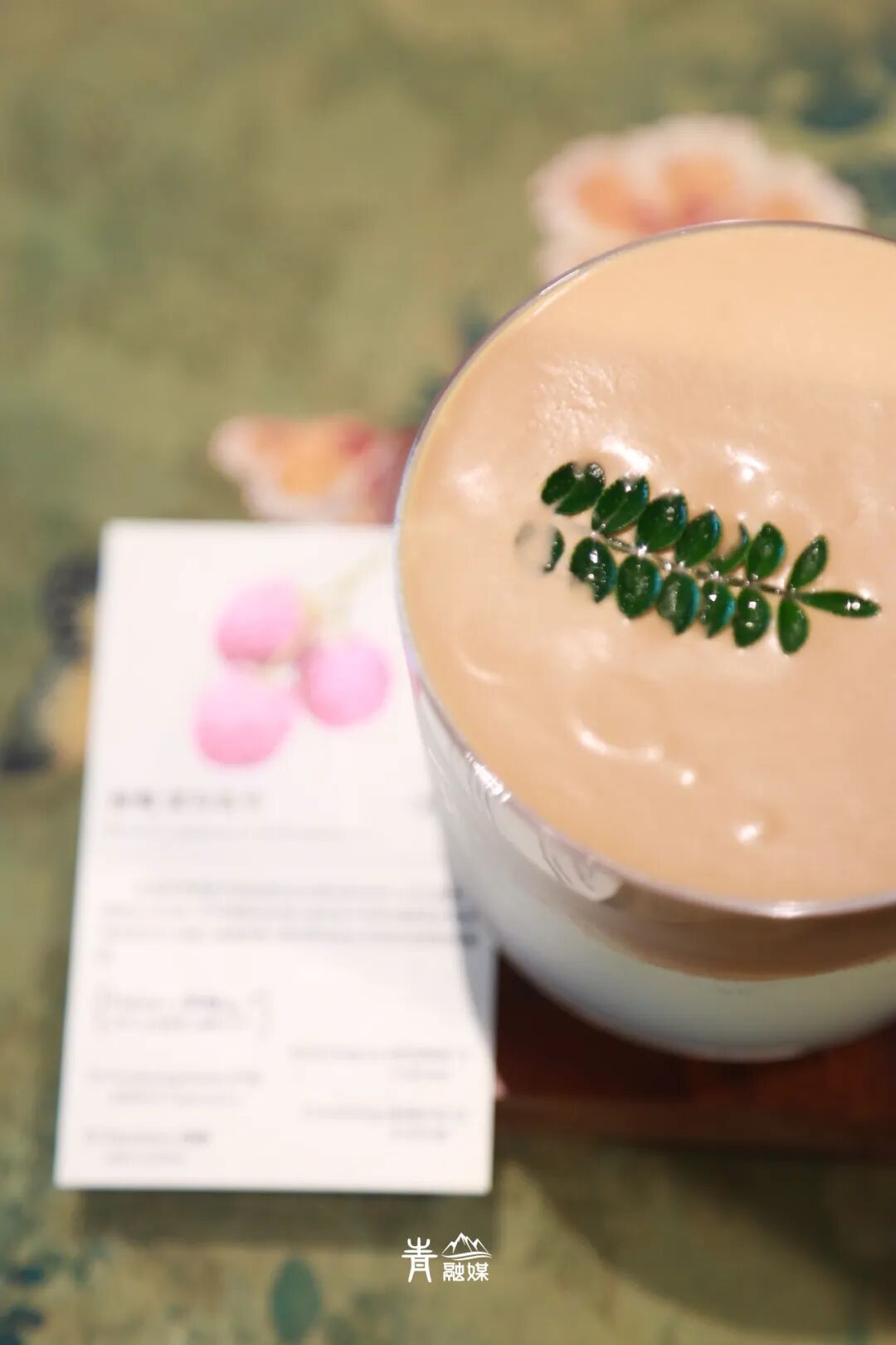 「盖碗拿铁」别出心裁地用盖碗做拿铁拉花,可以说把茶咖玩家的精髓拿捏住了!拿铁用的也是好豆子,看挂壁就知道能有多好喝,醇厚如黄油威化饼,奶泡光滑细腻的可以反光。忍不住几口就能干完了。