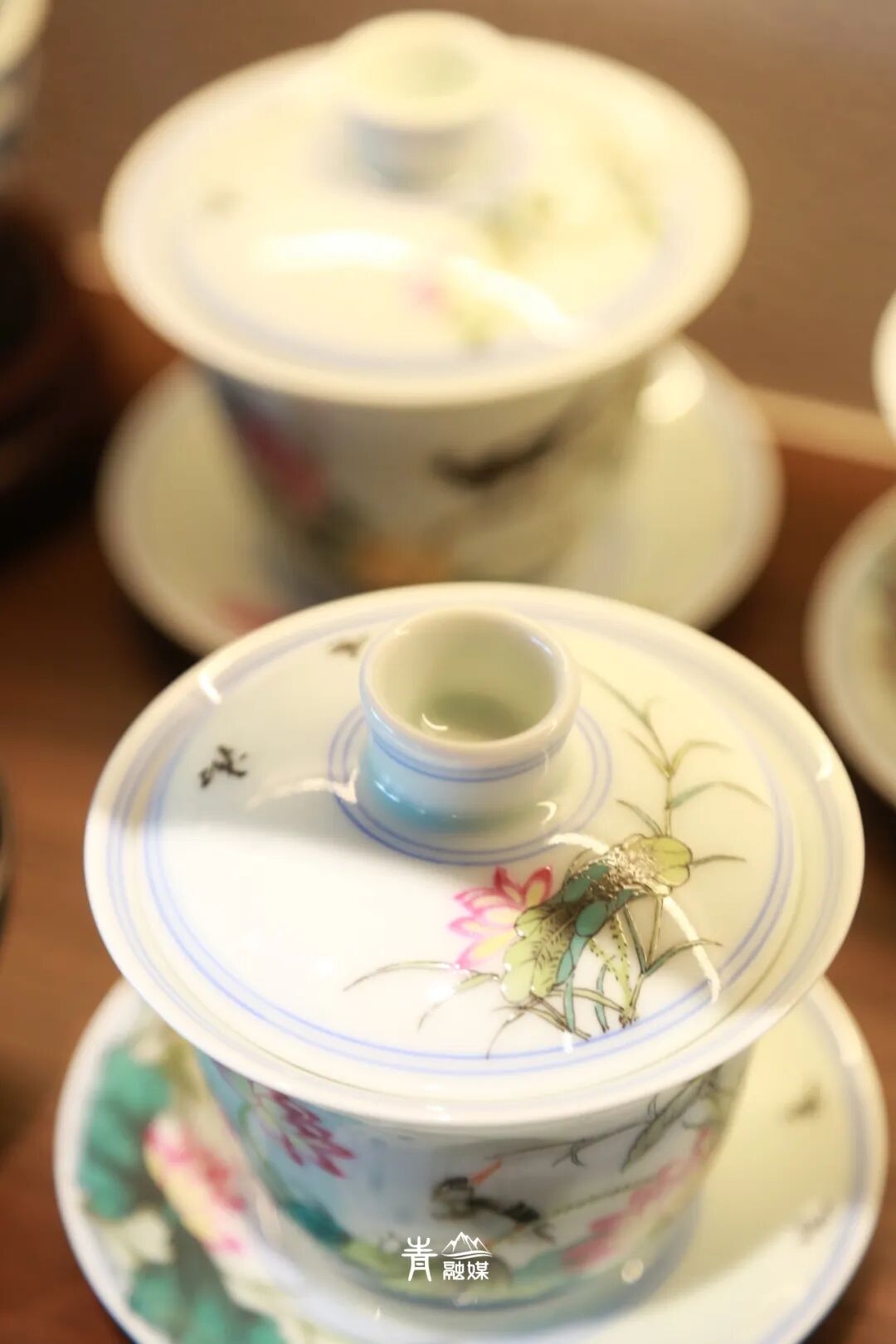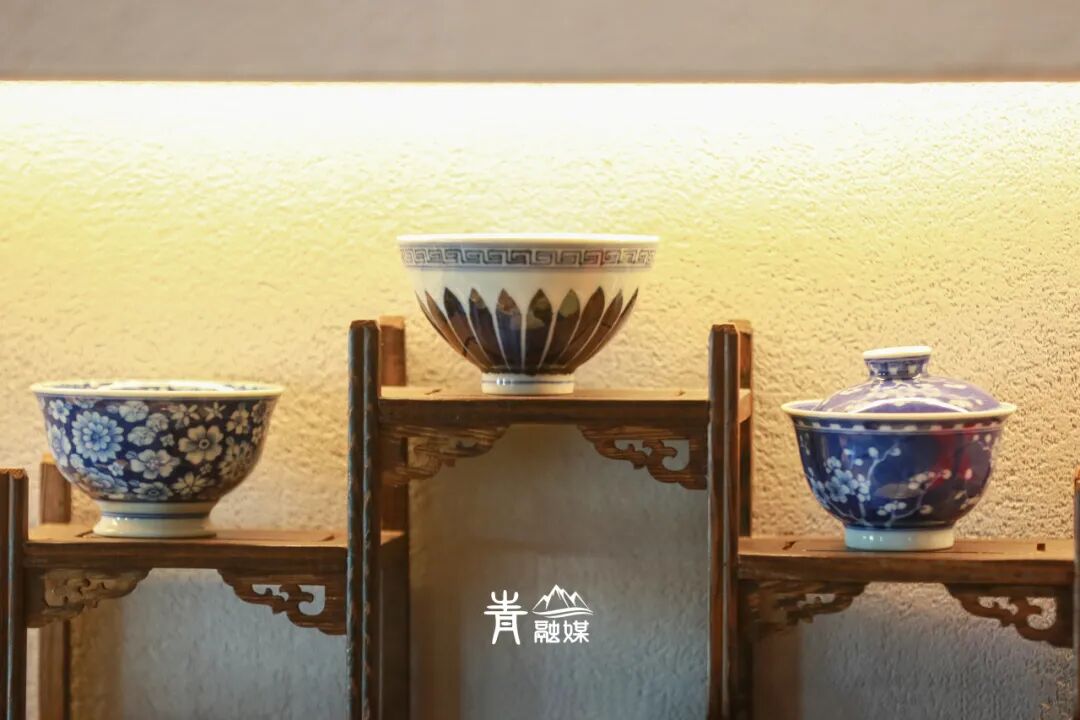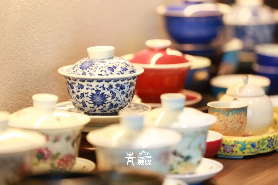珍贵的扒花工艺、釉下彩、青花釉里红等各类茶器,一一陈设在店里,为空旷明亮的空间增添了几抹亮色。