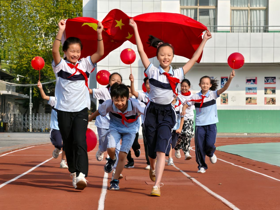 钢城二小503中队队员们与国旗同框,开心迎国庆