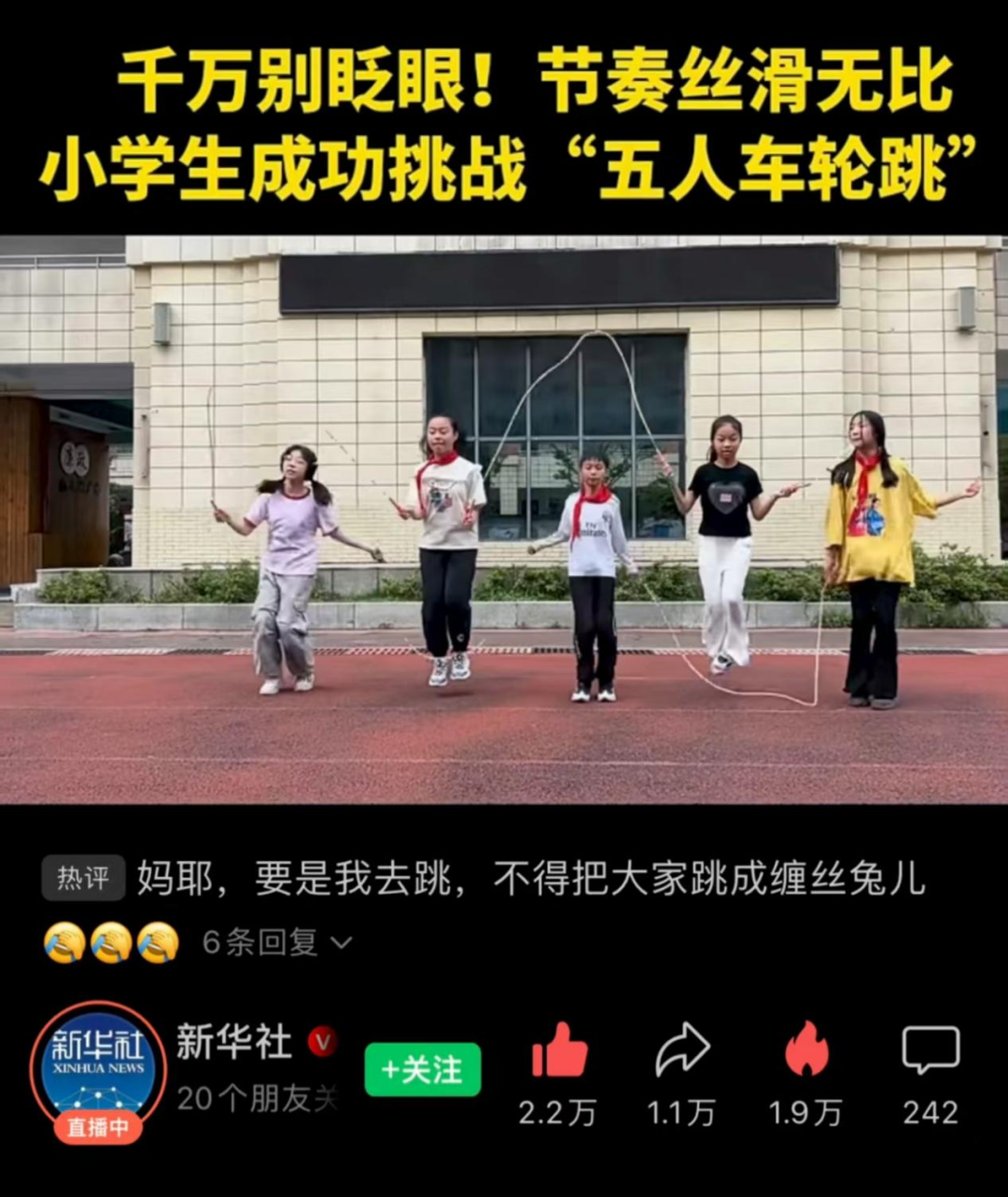 青山学子朝气蓬勃的精气神,火出了圈。今年6月,钢城第四小学的同学们展示花样跳绳“五人车轮跳”,在各大平台引发现象级传播——新华社、人民日报等中央媒体抖音号、视频号纷纷转发推荐。孩子们轻巧的身姿、快乐的面庞,累计收获超90万网友点赞,评论区更涌现近4万条真情留言。网友们表示:“这正是童年最动人的模样!”