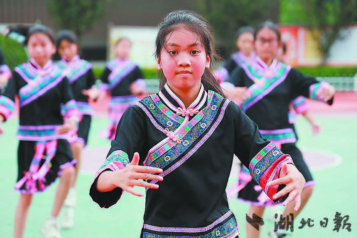 “我们学校紧邻唐崖土司城址,大课间活动要让土司文化从历史走进现实、走进校园。孩子们通过学习土司四门枪、踩高跷等传统项目,增强文化认同。”唐崖镇民族中心小学副校长唐薇说。