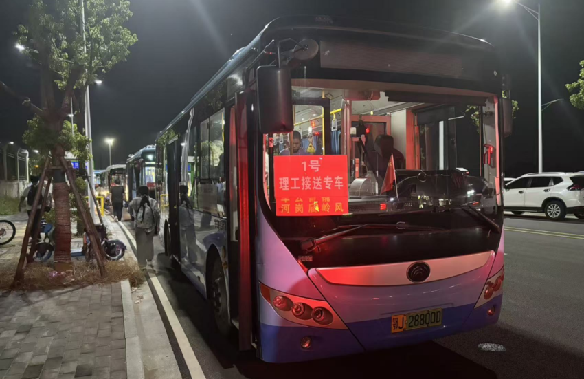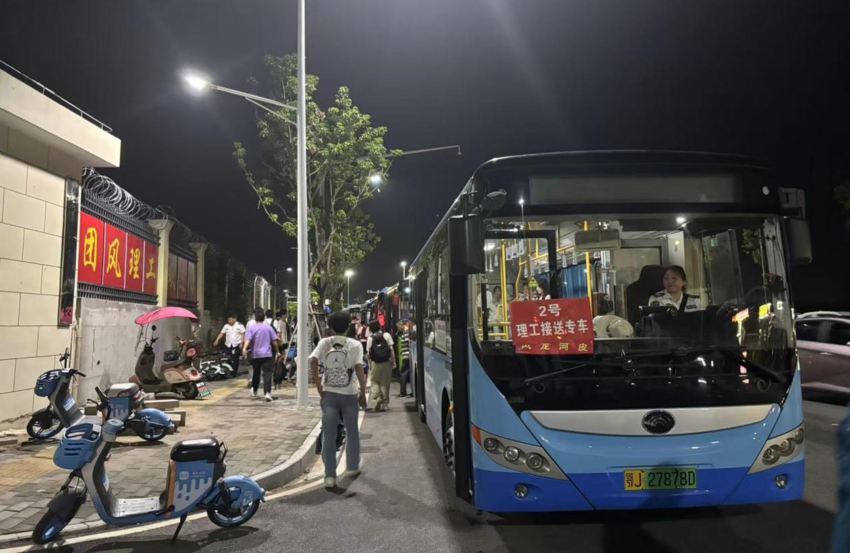 9月5日晚,夜幕下的理工中专新校区门口,8辆醒目标注“理工接送专车”的定制公交已在专用通道整齐列队、整装待发。随着放学铃声响起,学生们按照线路指引有序排队、亮卡乘车,全程不到10分钟便顺利登车,高效开启归家旅程,现场秩序井然。