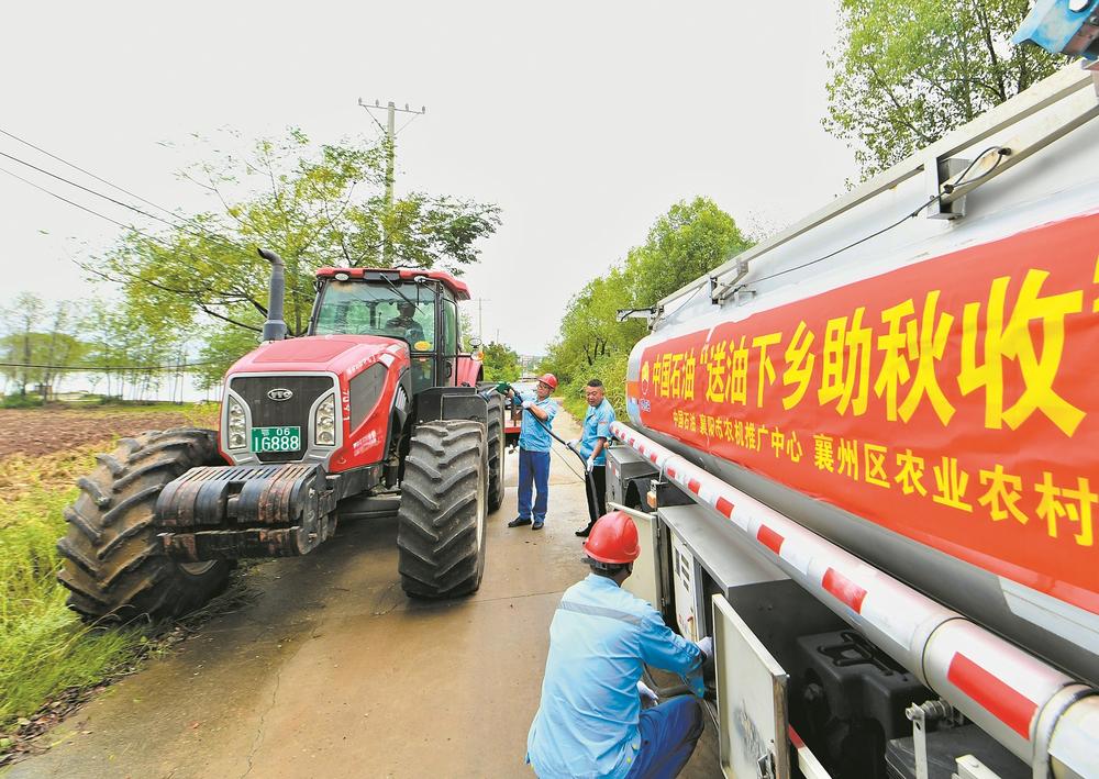 9月12日,襄阳市农机推广中心、襄州区农业农村局和中石油襄阳分公司在襄州区古驿镇联合开展“助农保秋收”活动。当天,各单位的工作人员分别来到佳富天宇农机专业合作社和鄂襄豪森谷物种植专业合作社,送技术、送物资、送服务,助力秋收。(来源:襄阳日报 张文豪 摄)
