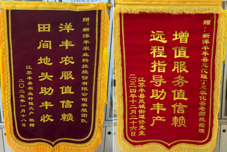 新洋丰市场推广部的办公室里挂着两面锦旗,“增值服务值信赖,远程指导助丰产”“洋丰农服值信赖,田间地头助丰收”。这是江苏丰县种植大户借参观荆门总部之机,特意送来的。