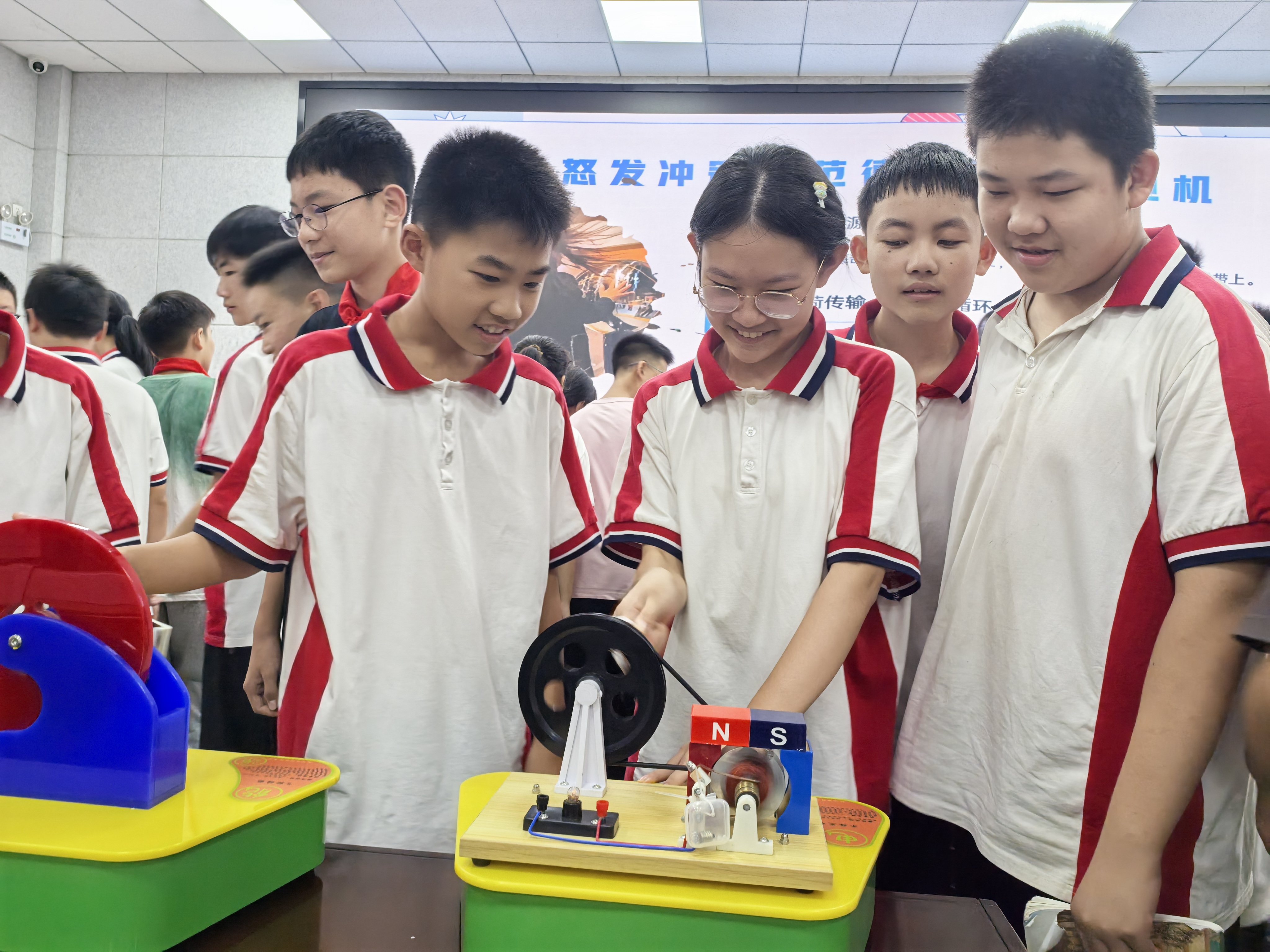 活动现场,涉及能源、动力、电磁、光学等方面的互动展品,将抽象的科学原理转化为可操作的动手体验,吸引了大批同学驻足体验,让科学原理更易于理解掌握,激发了他们探索科学奥秘的热情。