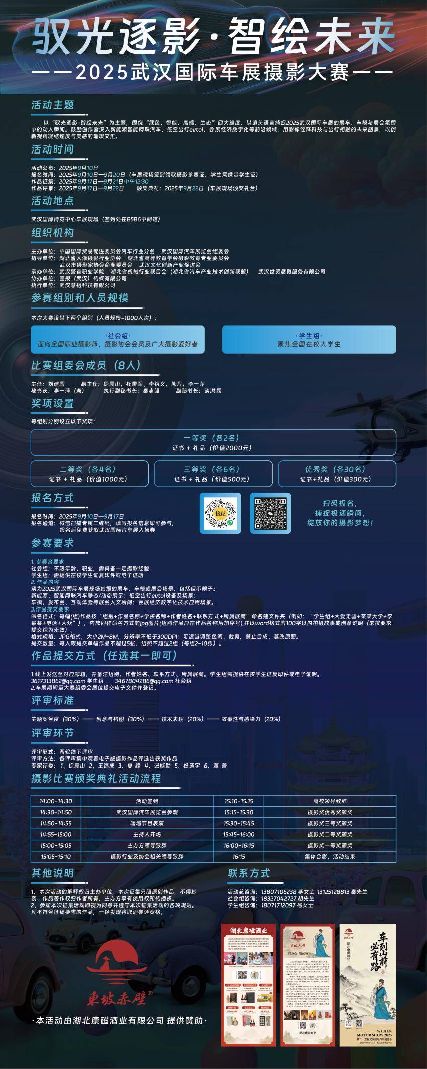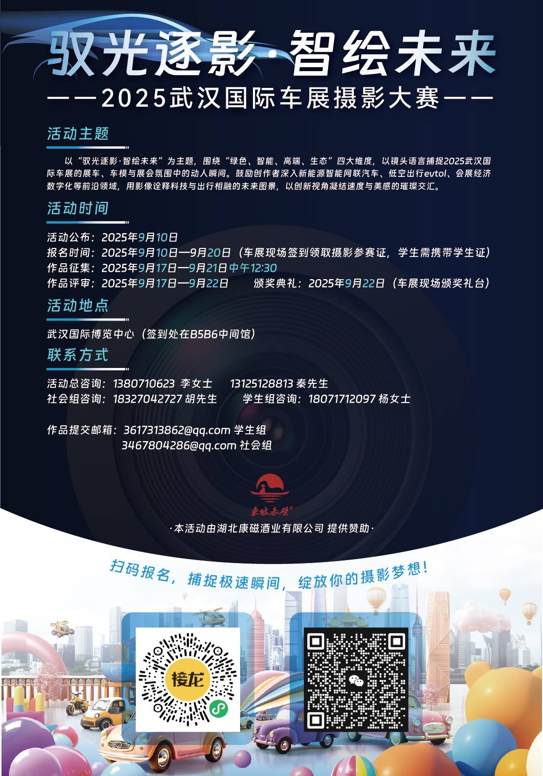 作为2025武汉国际车展的重要配套活动,本次摄影大赛不仅为摄影爱好者提供展现才华的舞台,更将通过影像力量传播汽车科技魅力,助力武汉会展经济与文化创意产业融合发展。目前扫码报名通道已开启,期待广大摄影人捕捉车展精彩瞬间,绽放摄影梦想!
