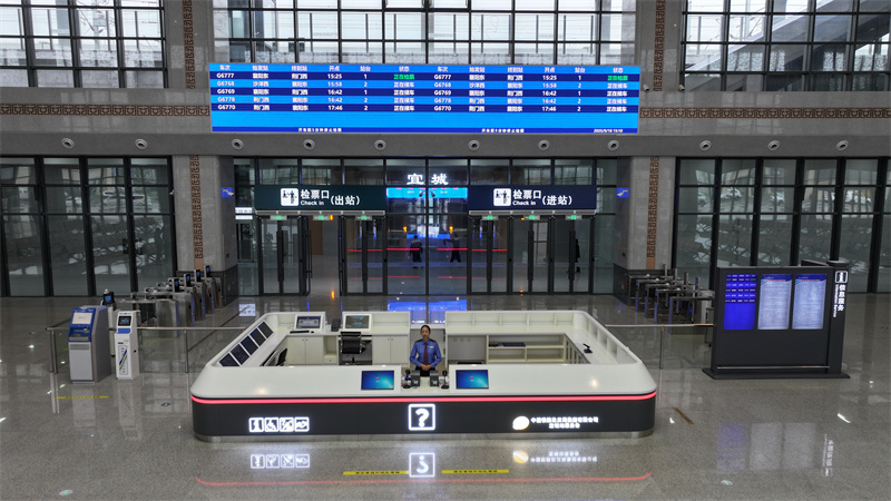 新建的宜城站站房布局开阔,候车区可满足日常及节假日高峰客流需求。站房采用文化融合设计,外立面提炼“楚皇城牌楼”特征,以中正大气的坡顶、飞檐、高台造型,呼应宜城“楚国古都、荆楚雄风”的深厚底蕴。