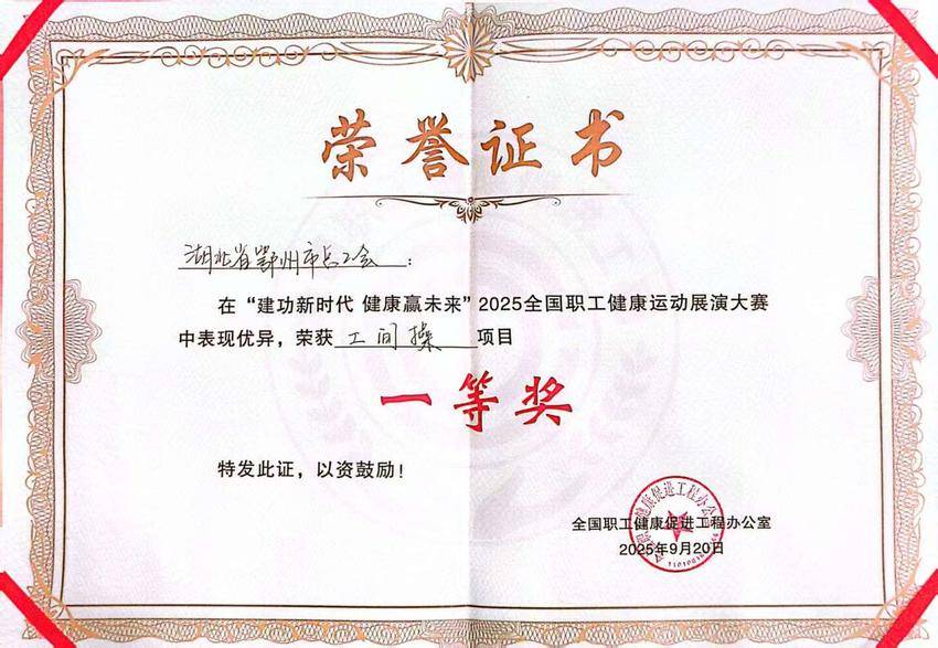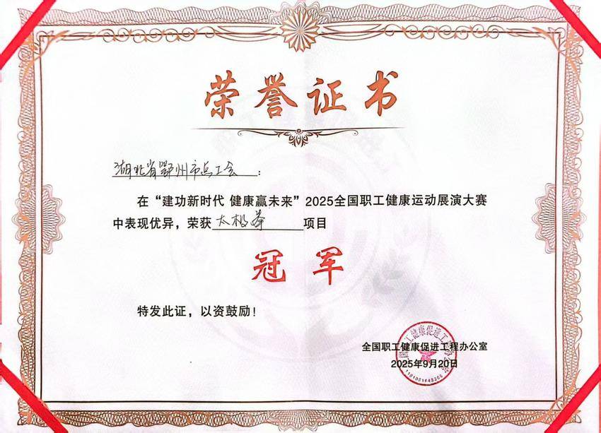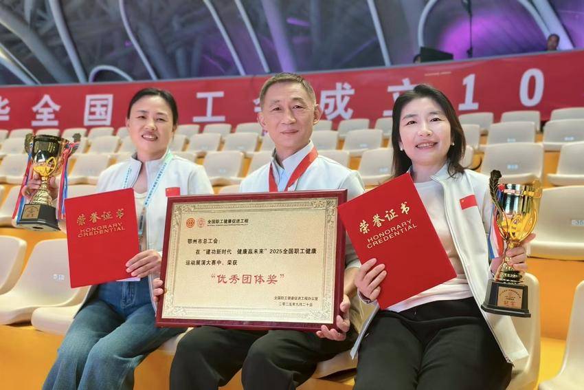 湖北日报客户端讯(通讯员魏君)9月20日,为期3天的2025全国职工健康运动展演大赛在北京世园公园闭幕。鄂州市总工会组建的职工代表队在太极拳、工间操集体项目中获得团体奖2项,个人奖7项。