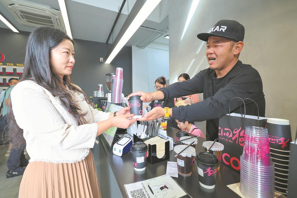 9月24日,参加第二届两岸青年创业沙龙暨项目路演交流活动的20多名台湾青年走进襄阳,参观了台湾青年郑伟祥、陈郁婷在襄经营的咖啡店。图为郑伟祥(右)为参观者送上咖啡。
