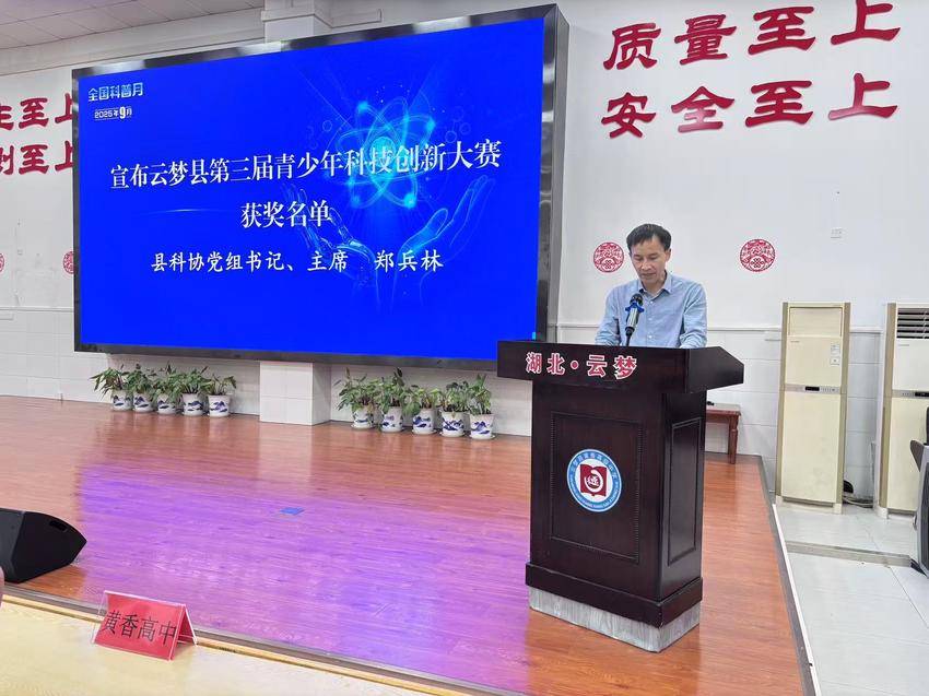 湖北日报客户端讯(通讯员邹璐 )9月26日,云梦县第三届青少年科技创新大赛颁奖活动在省级科普教育学校——云梦县黄香高中举行。云梦县政府副县长赵胜家出席活动,云梦县科协、县教育局、科技局、妇联、团委等部门主要负责人及获奖学校师生代表共同见证颁奖仪式。