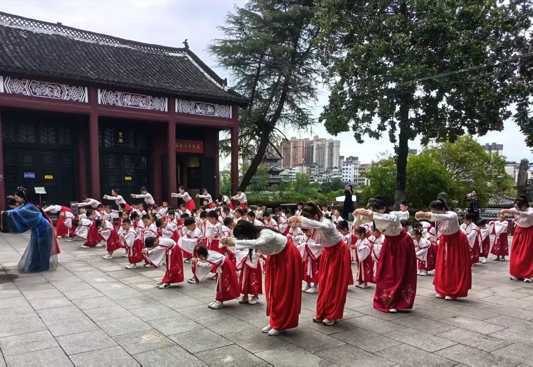 辰时初刻,学童们自状元门入,绕泮池三周。池水澄明,倒映青空,喻示学海无涯,当以澄澈之心求索。继而穿过棂星门——孩子们迈开了学礼知仪的第一步,象征着开启智慧之门,将来可以为中华文化“承先启后,继往开来”。至大成殿前,编钟鸣响,雅乐悠扬,全体师长吟诵《诗经·小雅·鹿鸣》,“呦呦鹿鸣,食野之苹”之声穿云裂石,瞬间将时空拉回两千五百年前的礼乐文明之境。