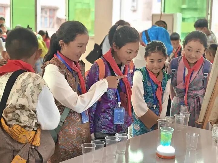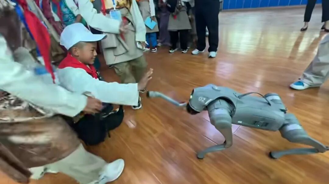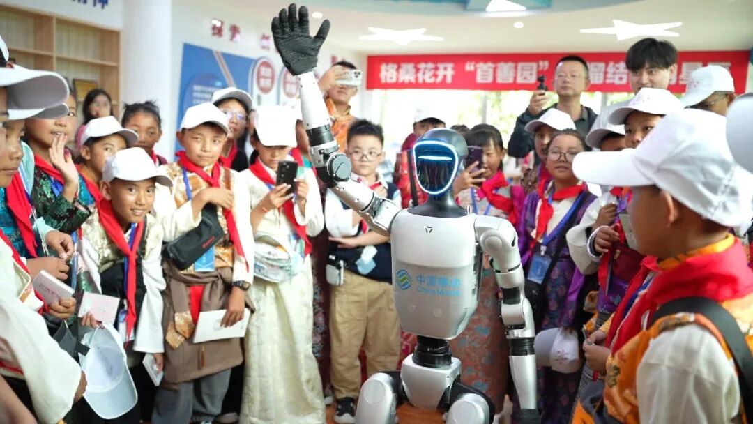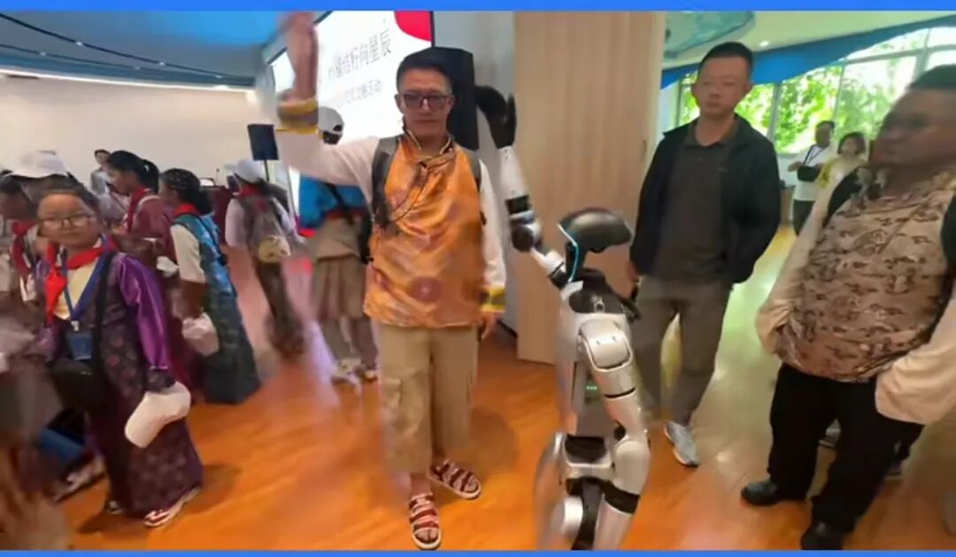 智能机器人互动环节更是将现场气氛推向高潮。当憨态可掬的机器人主动走上前与西藏师生握手、用清晰的语音打招呼,还迈着稳健的步伐在人群中穿梭“互动”时,孩子们的欢呼声此起彼伏,不少学生忍不住伸手触摸机器人,脸上满是惊喜与兴奋,现场成为一片欢乐的海洋。
