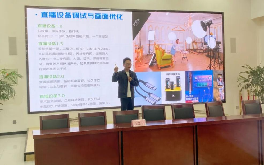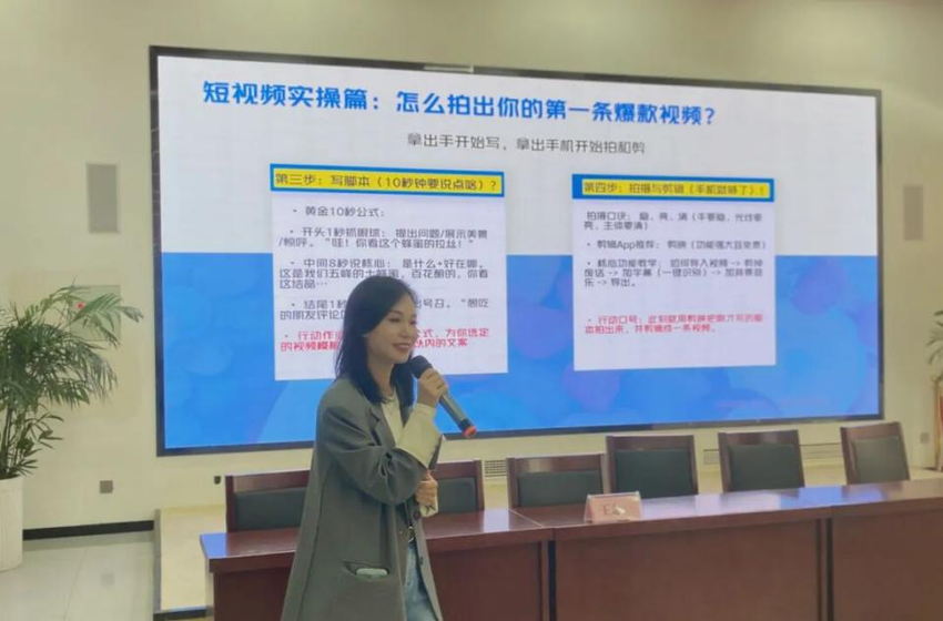 培训分理论和实操两个阶段进行。理论授课过程中,深耕直播电商领域多年的王念一老师、张剑老师分别结合自身实践以及各类爆款新农人账号的成功案例,展开细致讲解,分享如何用“家乡话+故事感”介绍农产品直播的专属话术技巧。随后,围绕如何拉近与观众的距离,借助现场直播间开展了针对性的实操培训指导。现场邀请5名学员上台亲身体验直播流程,从产品讲解话术到与观众互动的节奏,让学员沉浸式感受直播全环节。