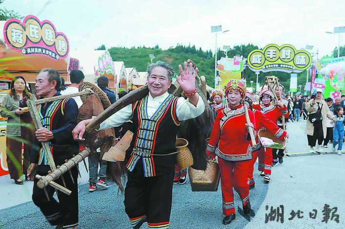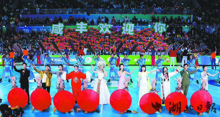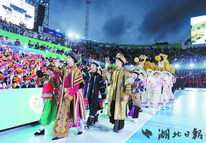 几天前的开幕式上,一场跨越六个世纪的“土司巡游”以穿越式展演还原历史场景。开道武士执戈先行,凛冽气势将全场拉回金戈铁马的土司时代;华服“土司”稳步前行,衣上每道纹饰诉说着昔日的尊荣;摆手舞鼓点铿锵,与篮球场跃动的节奏奇妙共鸣;满载的农耕箩筐,传递着这片土地的丰收密码。