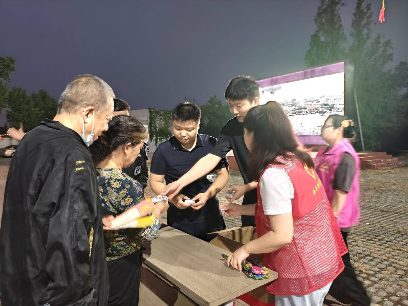 夜幕渐沉,露天电影《水饺皇后》正式放映,居民们围坐观影,孩子们依偎在长辈身旁,邻里间不时低声交流剧情,重现记忆中露天观影的温馨场景。
