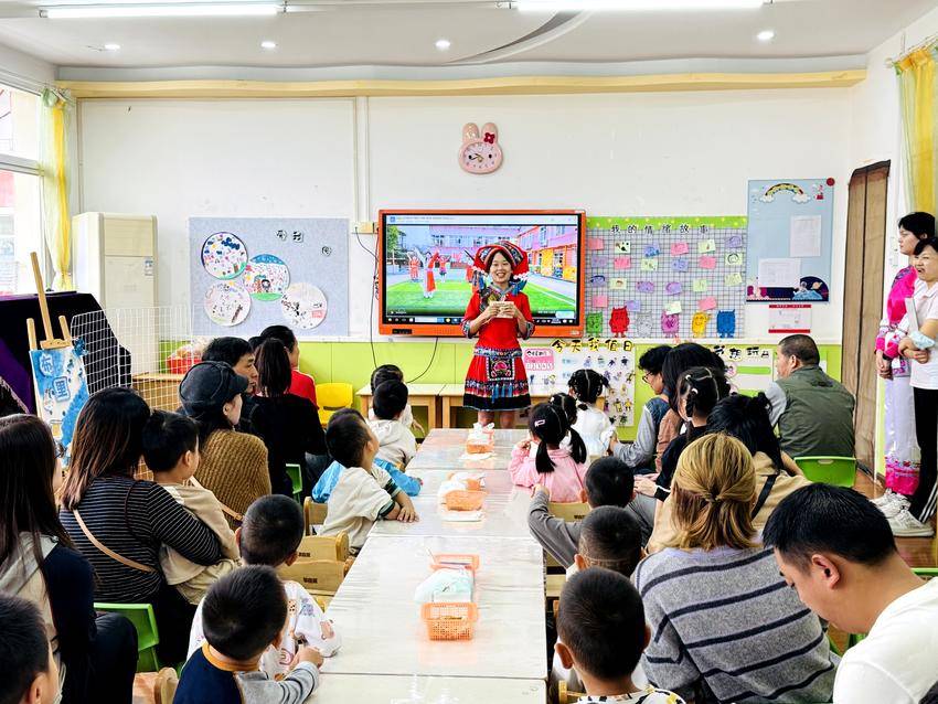 活动在欢乐的开场舞《民族一家亲》中拉开帷幕,民族文化体验区“泱泱中华 百花齐放”成为孩子们流连忘返的天地。各班级根据不同民族特色设置了独具匠心的手工体验项目。大一班傣族“竹编小馆”里,孩子们用各色彩色卡纸、黑卡纸和固体胶体验竹编工艺;大二班苗族“苗银闪亮亮”区域,锡纸制作的项圈、手镯、戒指等在阳光下熠熠生辉。中班白族“染铺”中,孩子们用塑料滴管将水粉颜料滴在洗脸巾上,创造出的扎染效果令人惊喜;小班汉族“明月照花灯”区,71个灯笼在彩笔的装饰下变得五彩斑斓。