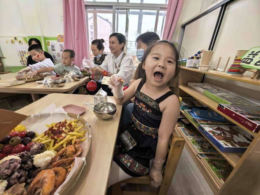 活动压轴环节“多彩民族宴 拳拳中国心”为孩子们带来了独特的民族美食体验。以簸箕为摆盘,盘中装饰着各民族卡通人物,美食与文化完美融合。在各班级用餐区,孩子们在品尝特色美食的同时,老师们适时讲解食物背后的民族文化,使孩子们在味蕾享受中增进对多元文化的认知。